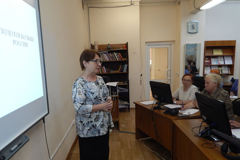 Слайд-экскурсия в Переславль-Залесский, подготовленная В.А. Буковской, главным библиотекарем кафедры периодических изданий, недавно посетившей город, позволила собравшимся совершить путешествие в прошлое. Основанный в 1152 году князем Юрием Долгоруким как будущая столица Северо-Восточной Руси, Переславль ныне входит в Золотое кольцо России.