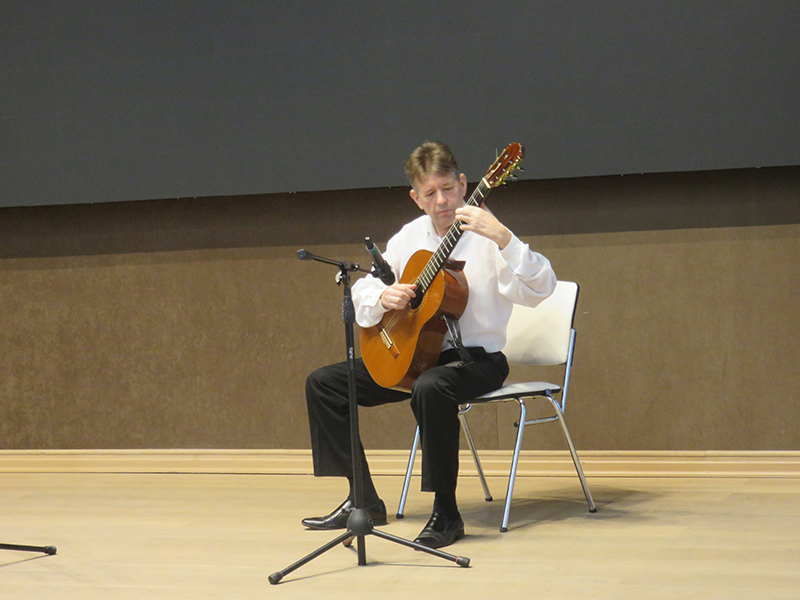 В концерте принял участие гитарист, преподаватель ДМШ № 1 им. Е.Д. Аглинцевой Александр Волков, замечательное мастерство которого было высоко оценено слушателями. Он исполнил сочинения Франсиско Таррега. «Прелюдию» и «Гран-вальс». Ф. Таррега – выдающийся испанский гитарист-виртуоз, композитор и педагог, основоположник испанской школы игры на гитаре. Блестяще закончил консерваторию по двум специальностям – фортепиано и композиции, но навсегда связал свою судьбу с гитарой. Автор многочисленных оригинальных сочинений и переложений для гитары известных композиторов. Среди его произведений – подлинные жемчужины – «Арагонская хота», «Арабское каприччио», «Воспоминание об Альгамбре». Пресса сравнивала Таррегу с крупнейшими исполнителями-современниками – скрипачом Пабло Сарасате и пианистом Антоном Рубинштейном.