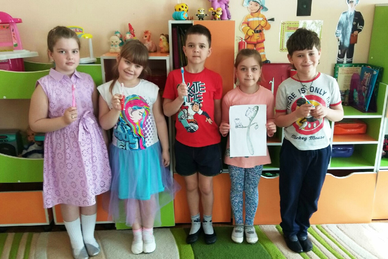 Детвора узнала, что существует множество различных видов зубных щеток: щетка с двумя головкам, которая позволяет чистить зубы сразу с трех сторон; зубная щетка с тюбиком вместо ручки; зубная щетка с видеокамерой (позволяет увидеть самые труднодоступные участки).