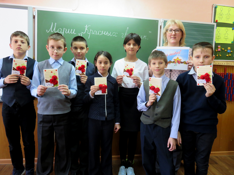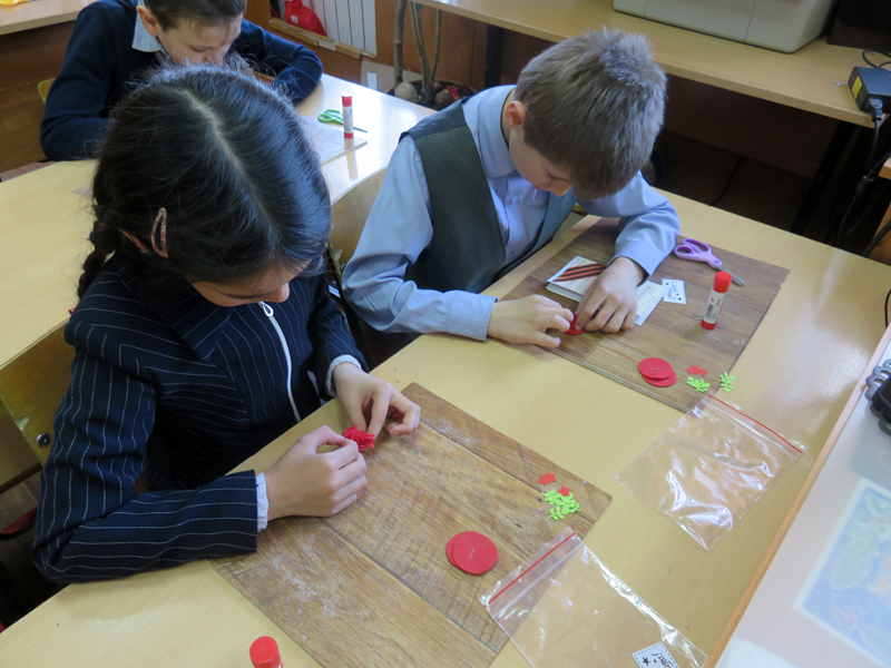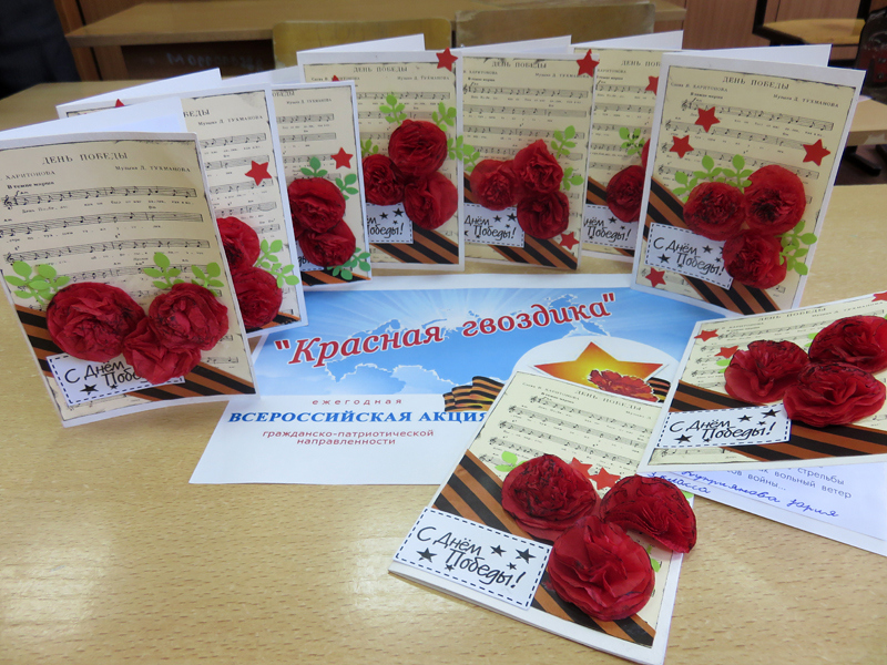 Мастер-класс начался с рассказа о победе нашего народа в Великой Отечественной войне. Ребята прочитали стихотворение «Что такое День Победы?» и вспомнили о том, какие ужасы принесла нашей стране война с фашистами. Затем весь класс приступил к изготовлению сувенира. Фоном для рукодельной открытки стала распечатанная песня «День Победы», а главным украшением – букет из красных гвоздик, который мальчишки и девчонки сделали из бумажных салфеток.
