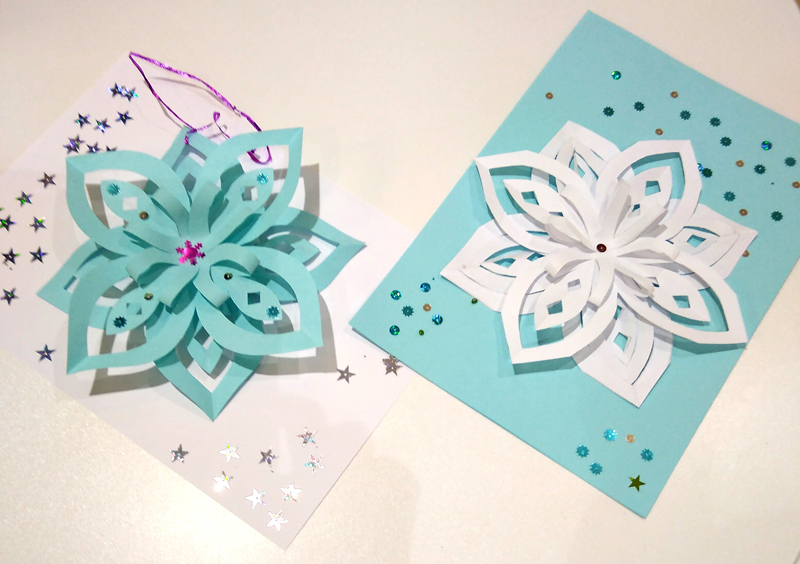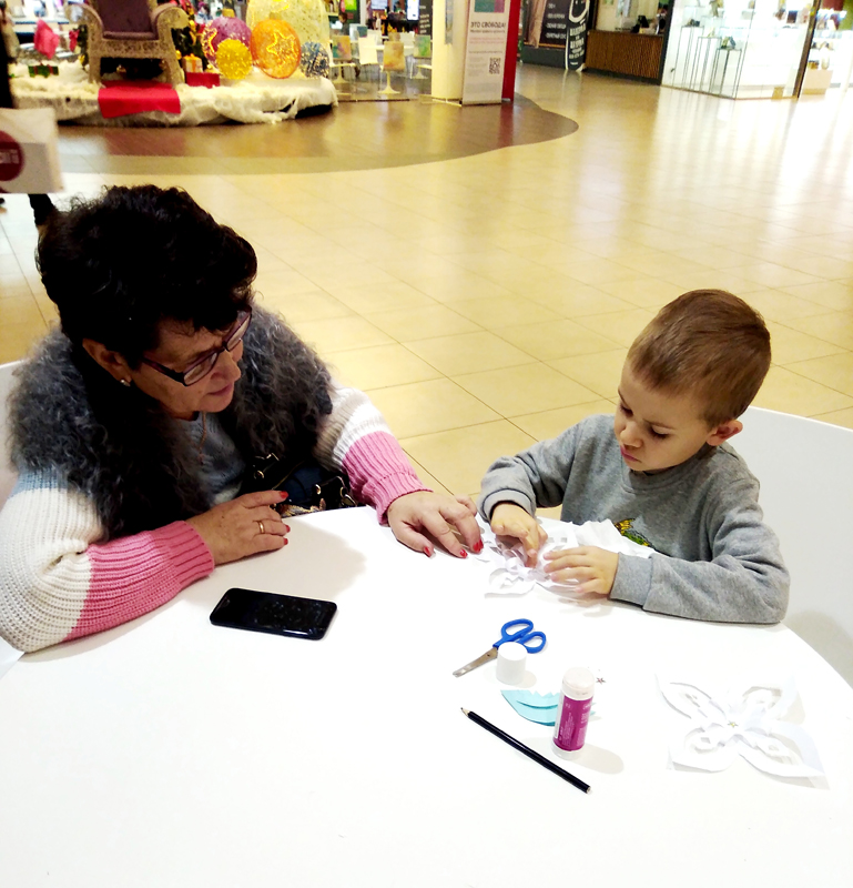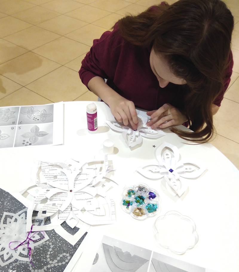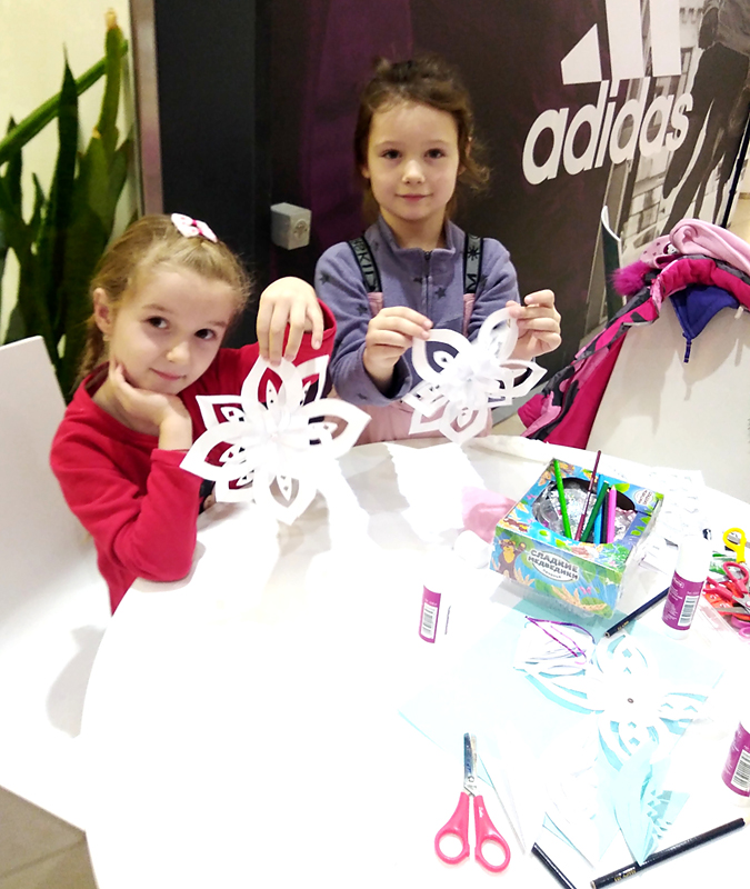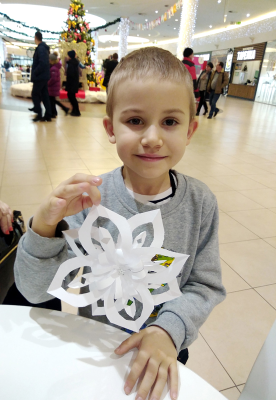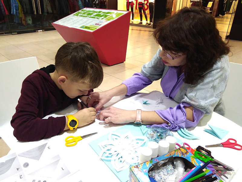 Довольные ребятишки, наравне со взрослыми, старательно мастерили объемные снежинки из бумаги – вырезали, клеили, украшали их бусинами, стразами и пайетками. Как сувенир, напоминающий об этом волшебном времени года, мальчишки и девчонки бережно понесли домой свои неповторимые кружевные снежинки.