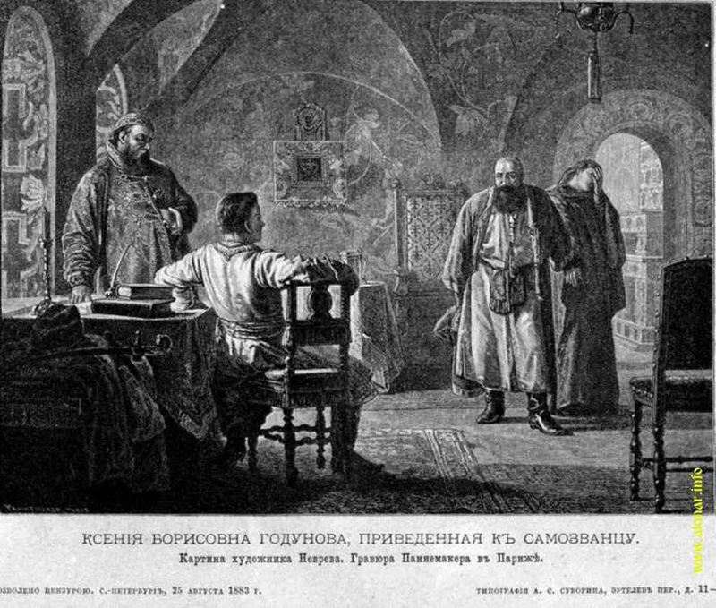 Победы Лжедмитрия, появившегося на границах Русского государства осенью 1604 года, ошеломили Годунова. 13 апреля 1605 года он внезапно скончался. На трон сел его сын Федор,но московские бояре переметнулись на сторону самозванца. На глазах Ксении мать и брат были убиты. Народу было объявлено, что Годуновы отравили себя ядом. Это случилось 10 июня 1605 года.