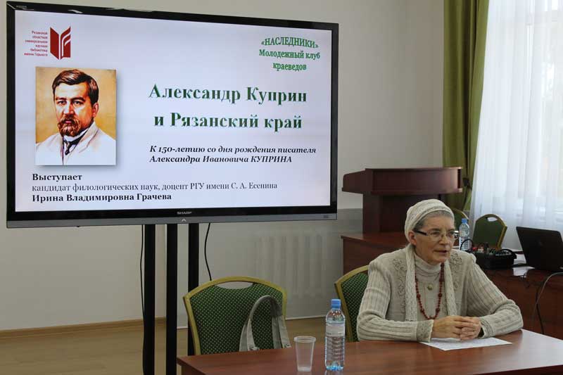 Перед «наследниками» выступила кандидат филологических наук, доцент Рязанского государственного университета имени С.А. Есенина И. В. Грачева. Она начала свою лекцию-исследование с вопроса: «Читали ли вы рассказы Куприна?», после чего повела свой рассказ о произведениях писателя, в которых упоминаются рязанские топонимы.