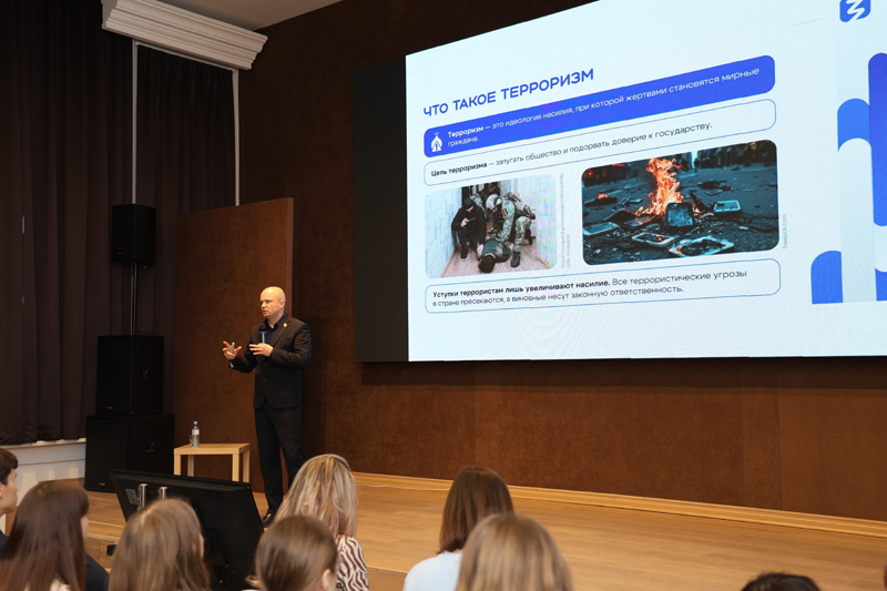 Роман Евгеньевич подробно рассказал школьникам, пришедшим на мероприятие, о современных методах борьбы с терроризмом, важности сотрудничества различных социальных институтов и роли каждого гражданина в обеспечении личной и общественной безопасности. Слушатели активно задавали вопросы и делились своими мыслями, что создало атмосферу живого диалога. Лекция сопровождалась информативной презентацией.