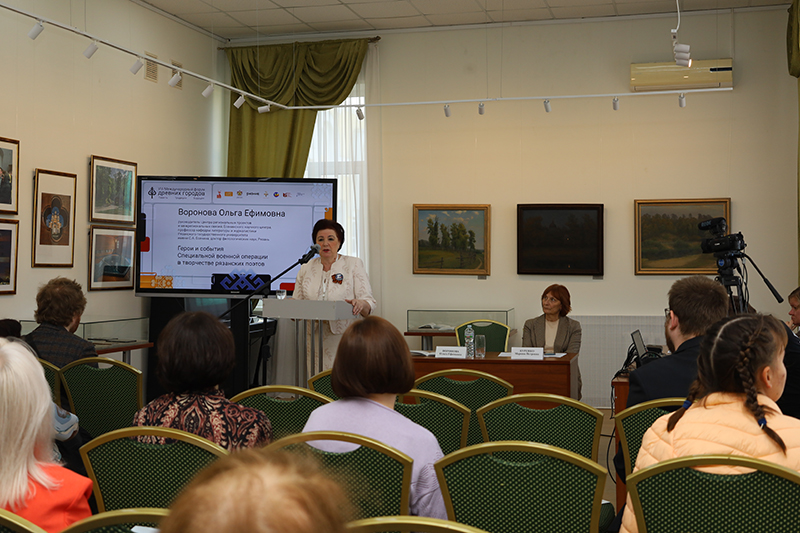 Ольга Ефимовна Воронова затронула очень актуальную тему в наши дни – «Герои и события Специальной военной операции в творчестве рязанских поэтов», представила новый сборник стихов «Священная рать» с произведениями В. Хомякова, А. Пронина, С. Панферова, О. Козловцевой, В. Хлыстова.