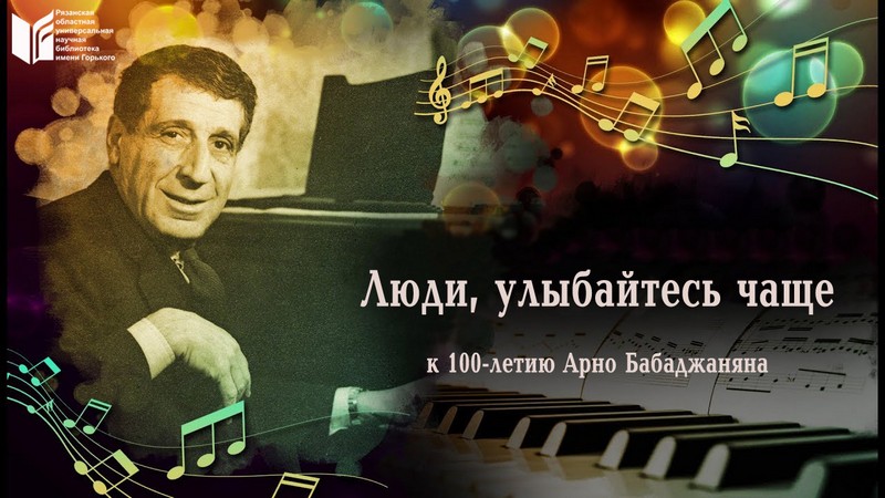 Предлагаем вашему вниманию онлайн-концерт «Люди, чаще улыбайтесь», подготовленный преподавателями и учащимися Детской музыкальной школы № 1, приуроченный к юбилею выдающегося композитора. Ведущая программы Елена Пронюшкина во время виртуальной встречи познакомит вас с жизнью и творчеством Арно Бабаджаняна.