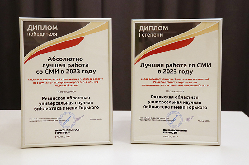 С гордостью сообщаем, что областная библиотека имени Горького заняла первое место среди региональных государственных и общественных организаций в номинации «Лучшая работа со СМИ в 2023 году», а также стала обладателем диплома «Абсолютно лучшая работа со СМИ в 2023 году» среди всех предприятий и организаций Рязанской области.