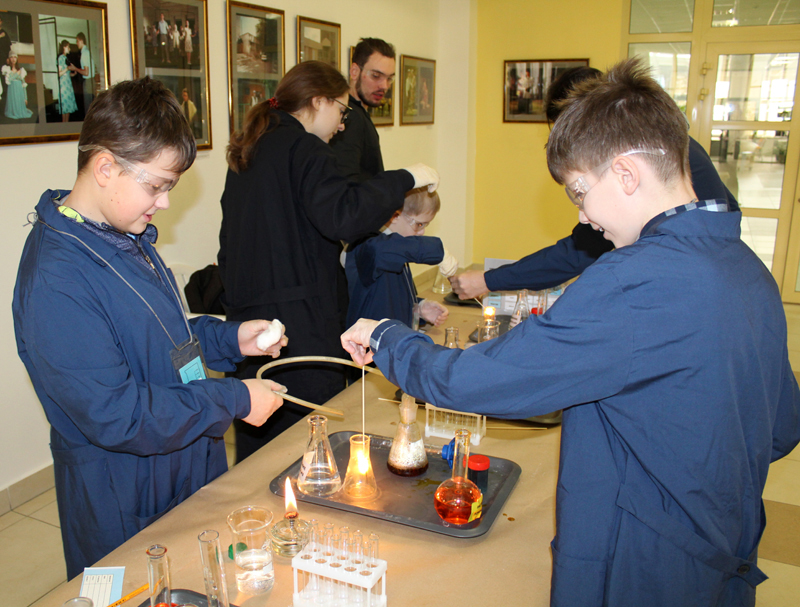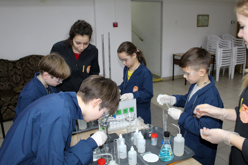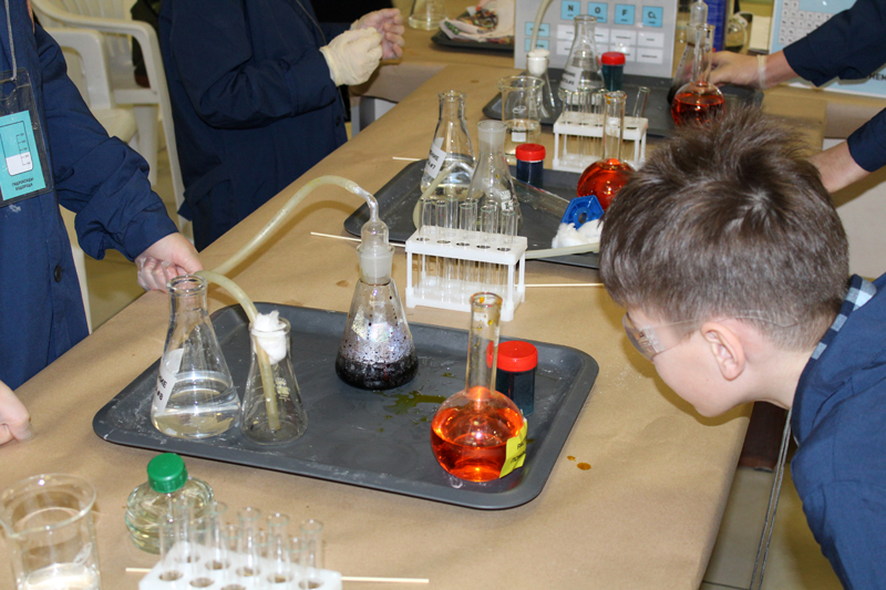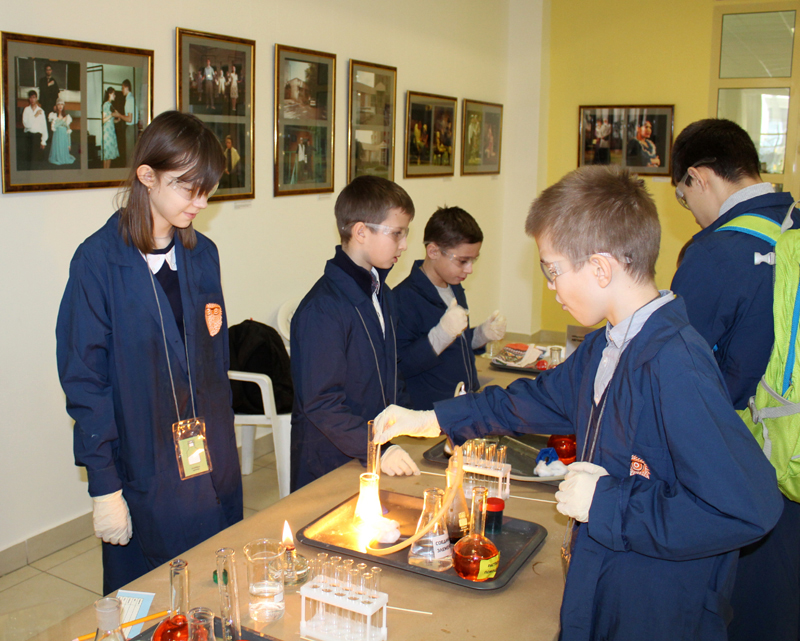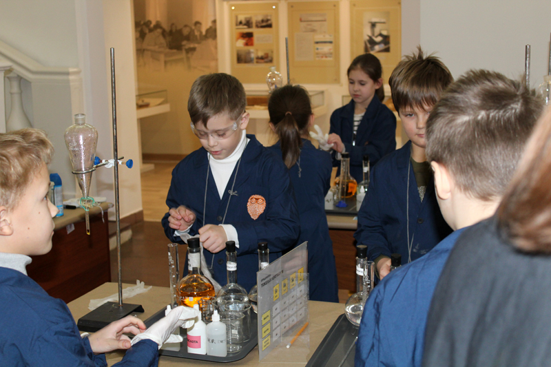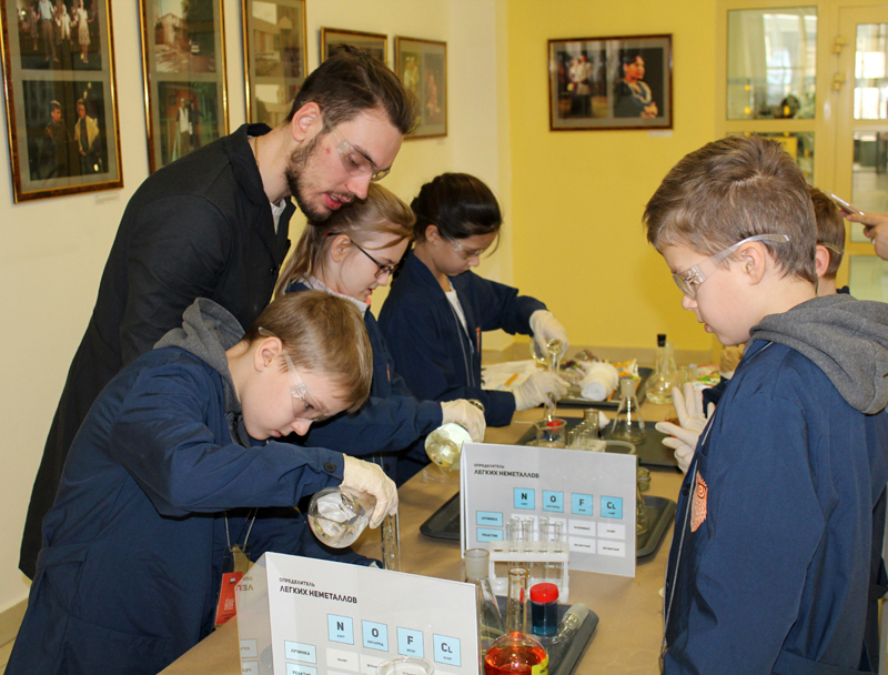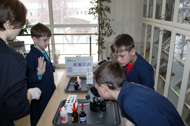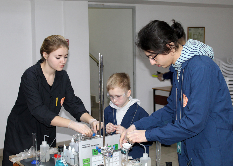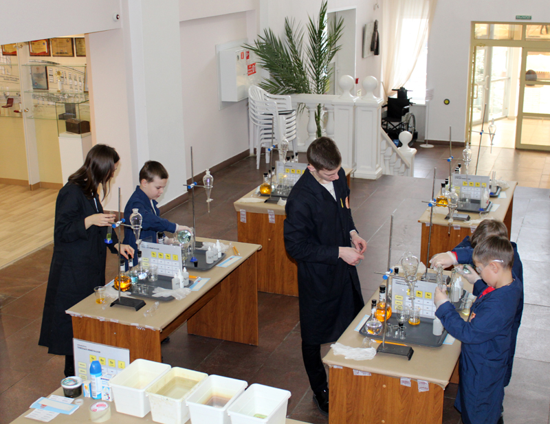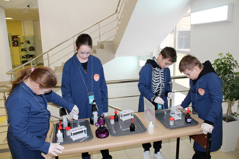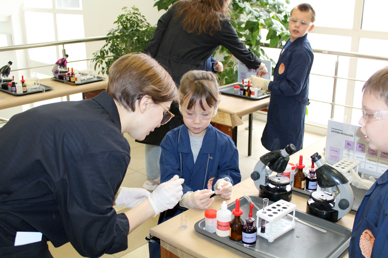 Всех участников разделили на команды «Карбонаты кальция», «Перманганаты калия», «Гидроксиды водорода» и «Хлориды натрия», каждая из которых побывала в четырех лабораториях. Ребята с большим интересом изучали свойства химических субстанций, получали простые и сложные вещества, проводили эксперименты по экстракции, фильтрованию. Для родителей была подготовлена отдельная программа – увлекательная лекция-викторина о великих химических открытиях и об известных ученых-химиках.