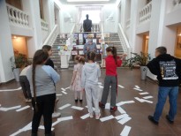 Детская программа продолжилась серией игр, к которым присоединились дети из летнего лагеря школы № 6. Разделившись на команды, они играли в подвижные игры народов мира, разгадывали пословицы и загадки, мастерили своими руками кукол в национальных костюмах для большого хоровода дружбы народов.