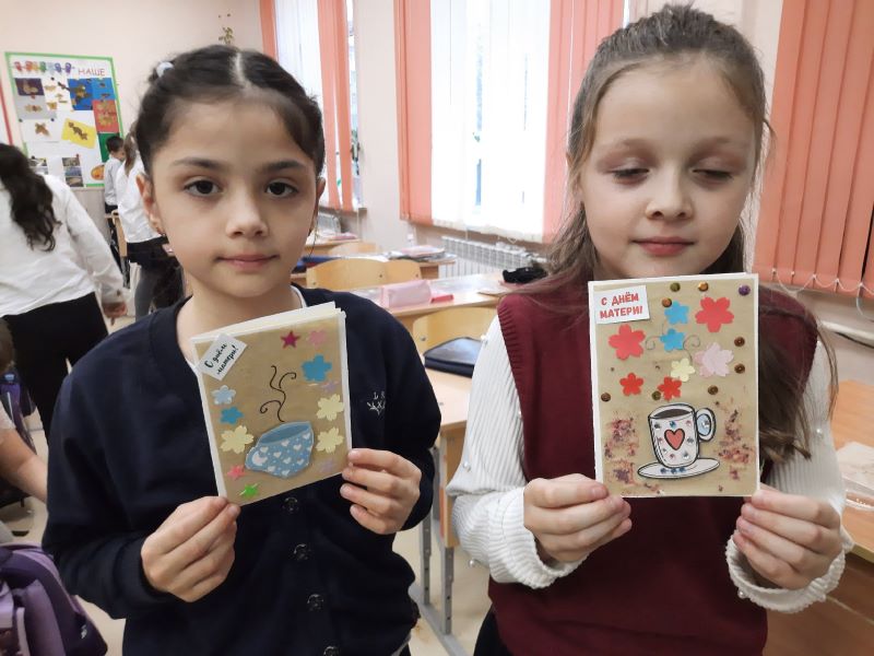 День матери в России – достаточно молодой праздник, 30 января 1998 года его учредил Президент Российской Федерации. За эти годы праздник полюбили в нашей стране и отмечают повсеместно, ведь во все времена мама была и остается самым главным и близким человеком для каждого из нас. В этот день спешат сказать теплые слова в адрес матерей, порадовать их цветами и подарками. Девчонки и мальчишки с огромным удовольствием принялись за создание самодельных открыток, чтобы порадовать своих любимых мам. Работа над открыткой оказалась не очень простой, но ребята отлично справились и даже успели написать несколько добрых слов для главного человека в жизни.