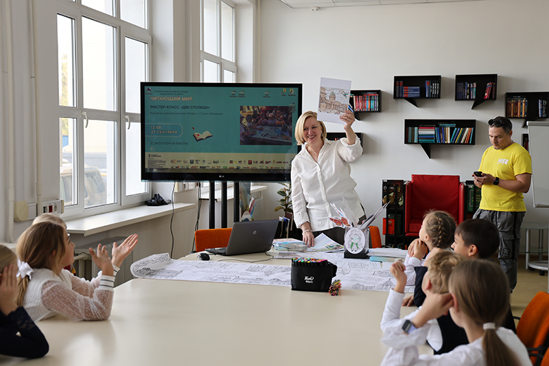 Вместе с героями книг ребята посетили Невский проспект, Красную площадь, увидели главные города России с высоты птичьего полета. На память о встрече школьники забрали с собой раскрашенные во время мастер-класса изображения достопримечательностей и книжные закладки с иллюстрациями от художников издательства «Графо».