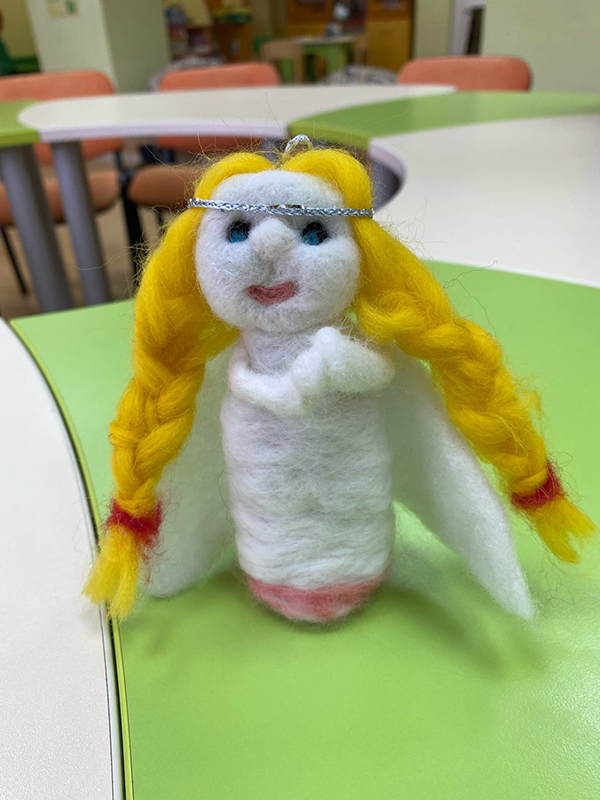 На мастер-классах преподаватель предложила участникам попробовать свои силы и создать Рождественского ангела из валянной шерсти. Юлия рассказала ребятам о технике валяния из шерсти, обсудила дизайн их поделок и показала этапы работы. В ходе занятий преподаватель помогала всем участникам, давала советы, как сделать поделку наиболее выразительной и объемной. Итогом стали оригинальные поделки из валянной шерсти, которыми, надеемся, участники украсят свои новогодние елки.