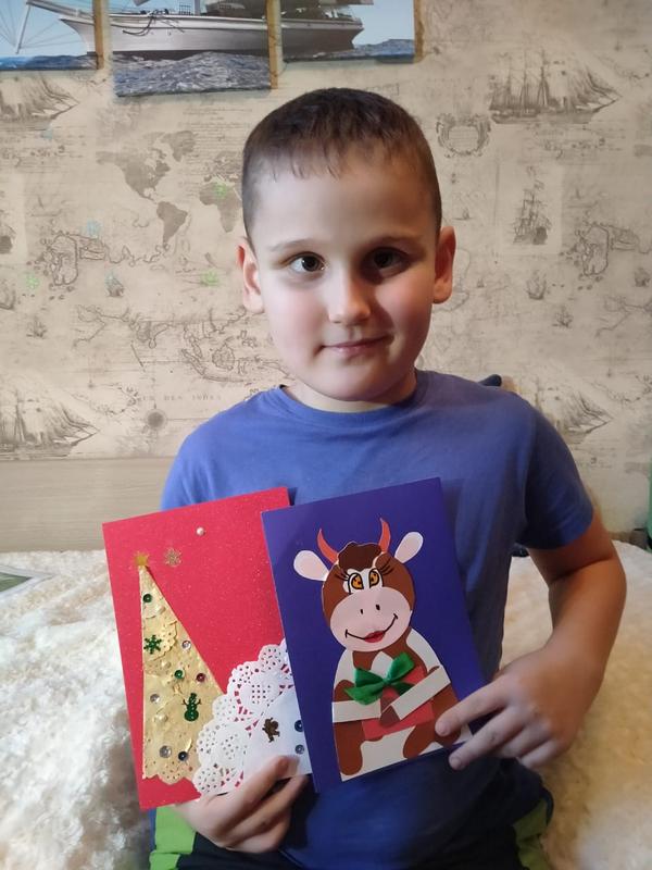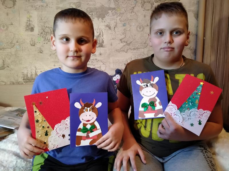 Никита Гукин и Матвей Шахов – очень активные мальчишки и не сидят без дела. В этот раз братья выполнили мастер-классы по созданию открыток «Бычок – символ 2021 года» и «Ёлочка из салфетки», с которыми они очень быстро справились. Мальчики весело провели время, помогая друг другу. И с каждым разом мастер-классы все интереснее и увлекательнее, ребятам очень нравится их выполнять.