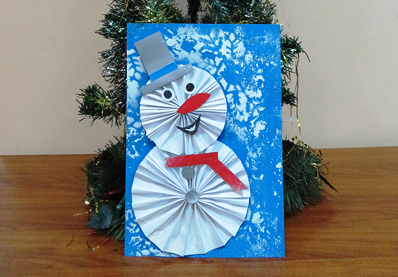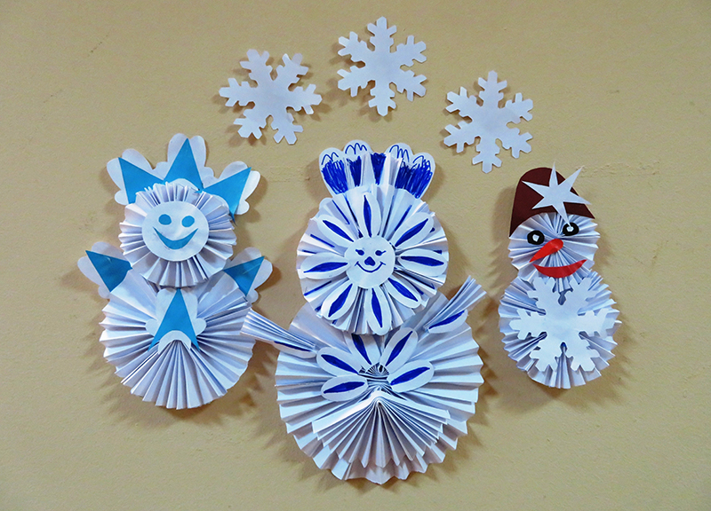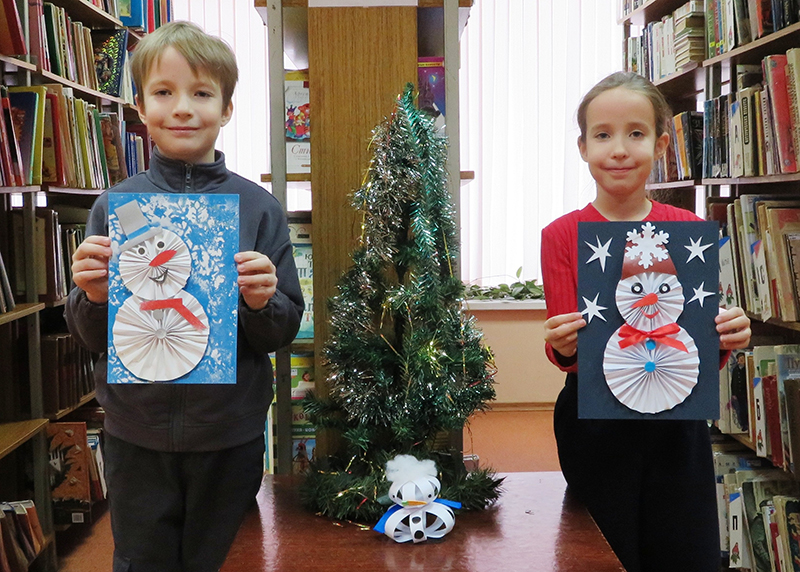 Для изготовления такого снеговика наши маленькие читатели использовали белую и цветную бумагу, шелковые ленты, ножницы и клей-карандаш.