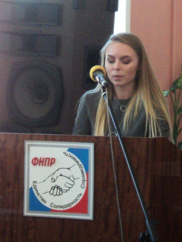 Член молодежного совета профобъединения, член молодежного парламента при Рязанской областной Думе М.И. Ларина говорила о взаимодействии молодежного совета профобъединения с молодежным парламентом при Рязанской областной Думе в вопросах социальной защиты молодежи.