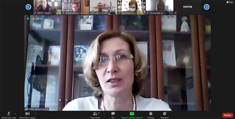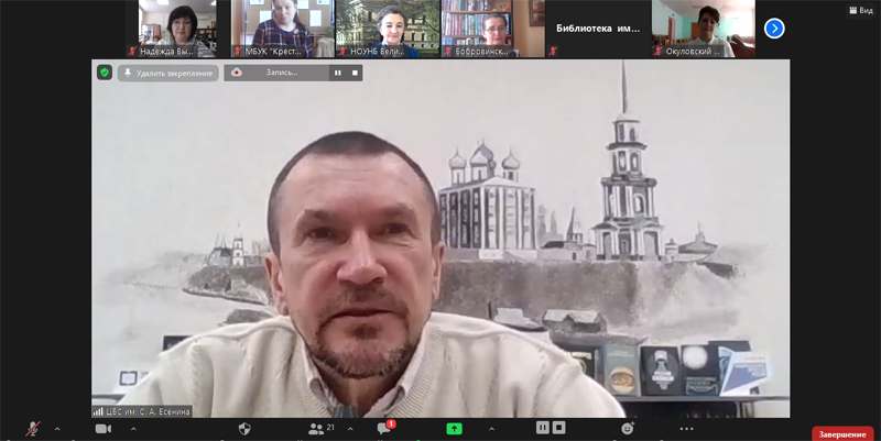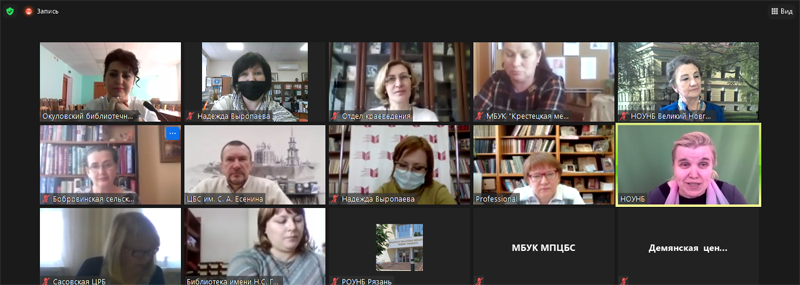 В онлайн-режиме на платформе Zoom состоялся межрегиональный вебинар «Литературное краеведение в библиотеке», организованный Рязанской областной универсальной научной библиотекой имени Горького и Новгородской областной универсальной научной библиотекой. Модератором мероприятия выступила Людмила Алексеевна Петрова, заведующая научно-методическим отделом Новгородской областной библиотеки. В вебинаре приняли участие библиотечные специалисты из Рязани, Кораблинского, Сасовского, Шиловского муниципальных районов Рязанской области, а также Великого Новгорода, Крестецкого, Окуловского, Старорусского муниципальных районов Новгородской области.