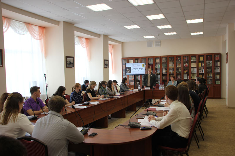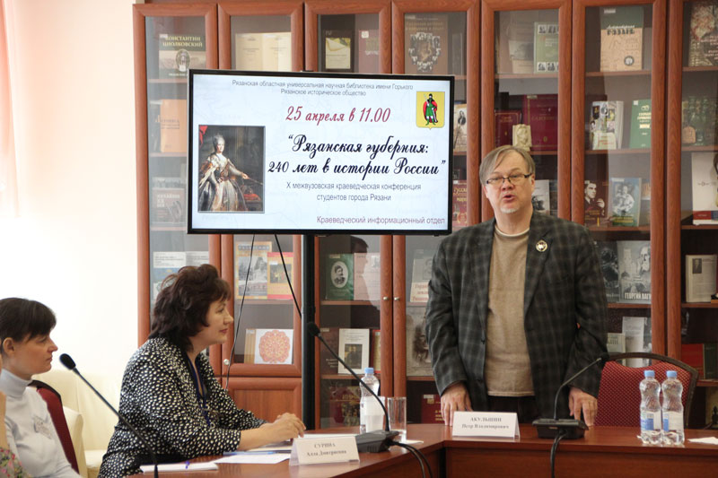 Доктор исторических наук, профессор Рязанского государственного университета имени С.А. Есенина П.В. Акульшин и директор библиотеки Н.Н. Гришина возглавили президиум студенческой конференции, прошедшей в РОУНБ им. Горького. В своем приветственном слове Наталья Николаевна рассказала о мероприятиях, посвященных этой дате, которые проводятся в регионе и областной научной библиотеке имени Горького. Прозвучало Приветствие главы Российского императорского дома, великой княгини Марии Владимировны в связи с 240-летием учреждения Рязанской губернии.