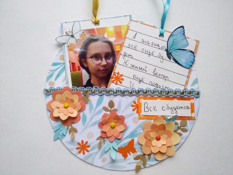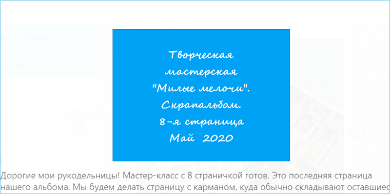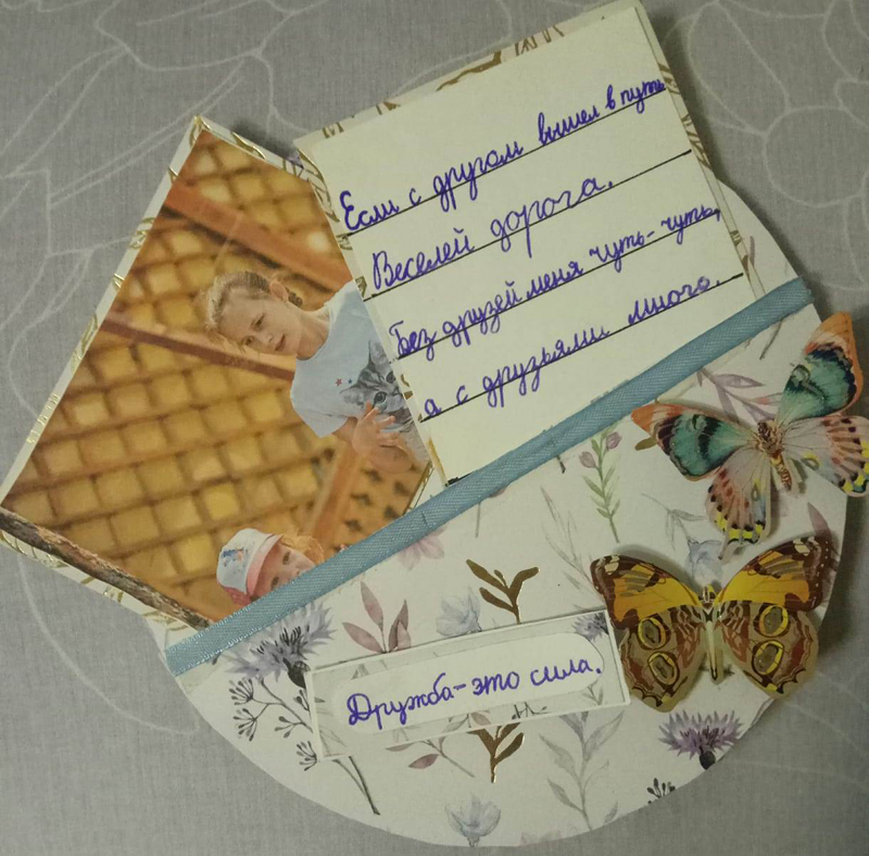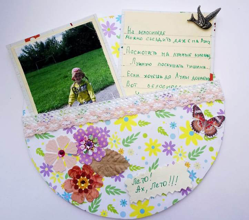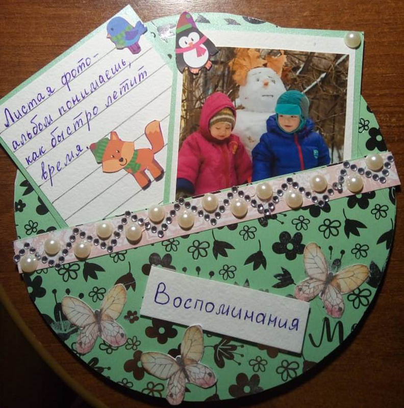 В виртуальном интернет-пространстве состоялось очередное занятие творческой мастерской «Милые мелочи». Участники клуба создали страницу фотоальбома с декоративным кармашком, в который обычно складывают оставшиеся фото, записки с каким-то объяснением. Юным мастерицам нужно было не только повторить пошаговую видеоинструкцию, но еще самостоятельно придумать краткое описание всего альбома или фотографии, а также надпись к странице.