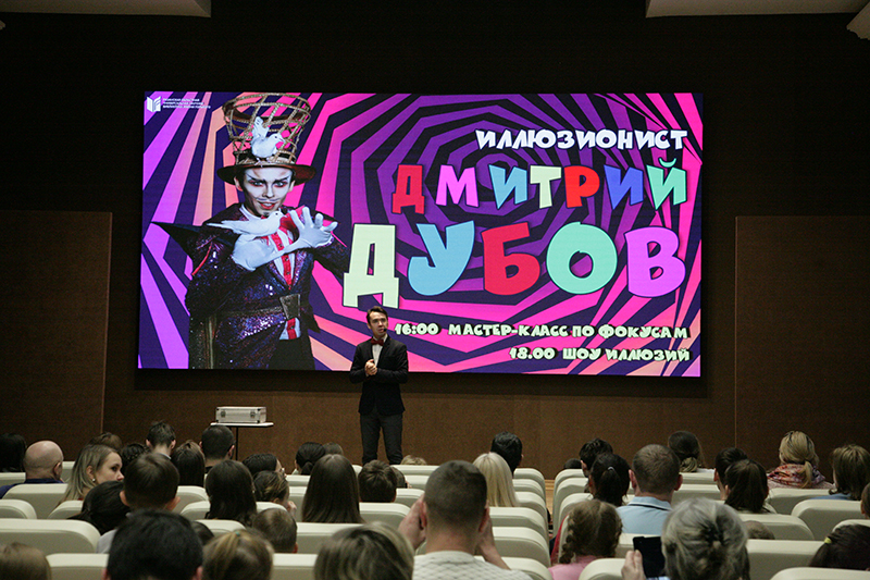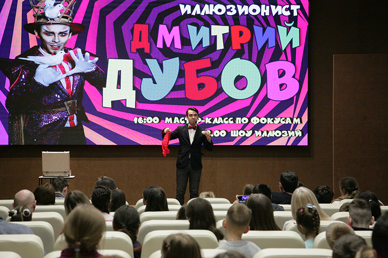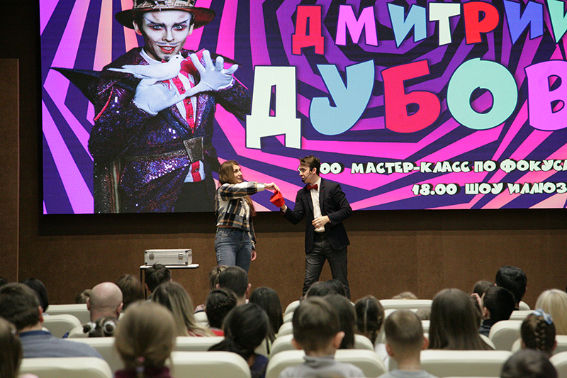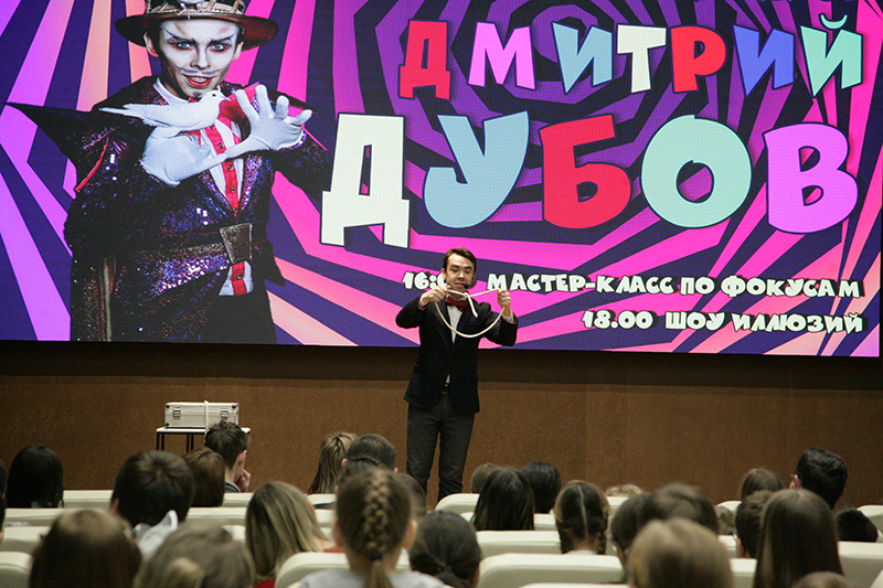 После мастер-класса для детей иллюзионист Дмитрий Дубов, известный зрителям как участник телепередачи «Петросян-шоу», представил свое шоу иллюзий. В этот вечер он стал для гостей библиотеки персональным гидом в мир магии и волшебства.