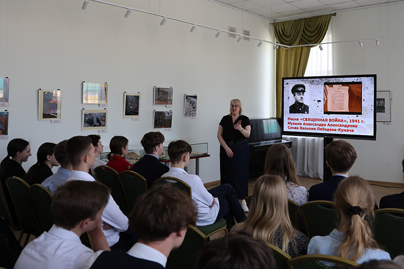 Сотрудники Центра литературы по искусству познакомили ребят с произведениями, непосредственно участвующими в борьбе советского народа, усиливающими его готовность отстоять свободу и независимость Родины. Неподдельный интерес вызвала история создания песни-символа А. В. Александрова «Священная война», песен «В землянке», «Темная ночь», «Жди меня», «Смуглянка» и др. Внимание участников встречи привлек и рассказ о фронтовых концертных бригадах, выезжавшими с выступлениями на всех фронтах и направлениях. Музыканты, танцоры, театральные и цирковые артисты сопровождали Красную Армию в самых трудных битвах и вместе с ней дошли до Берлина.
