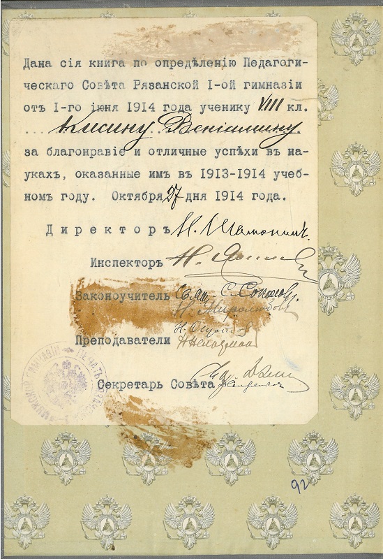 В конце августа, когда студенты и школьники готовятся к началу учебного года, сотрудники центра редких и ценных изданий Рязанской областной библиотеки имени Горького с ностальгией достают с полки книги, подаренные воспитанникам дореволюционных учебных заведений «за благонравие и отличные успехи в науках».