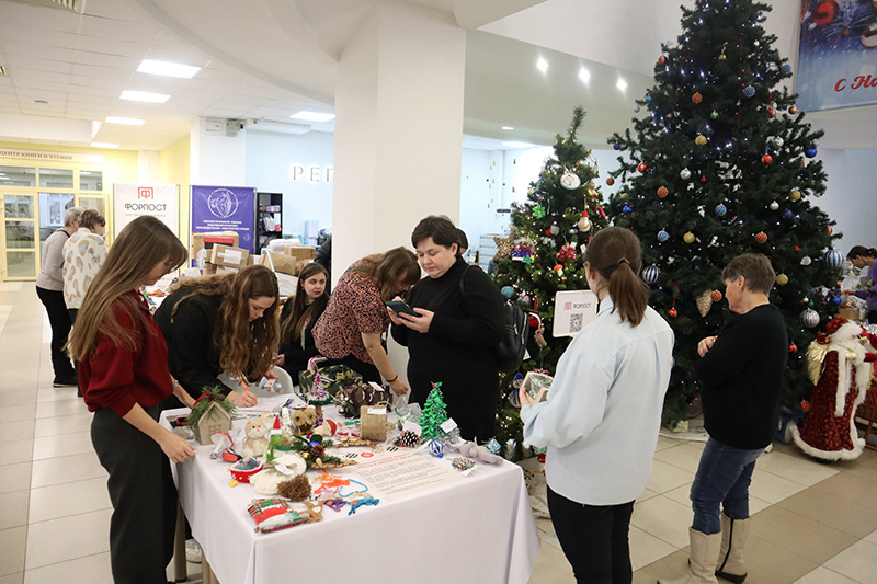 Благотворительная ярмарка по продаже ёлочных игрушек будет работать до конца января 2025 года в холле библиотеки имени Горького.