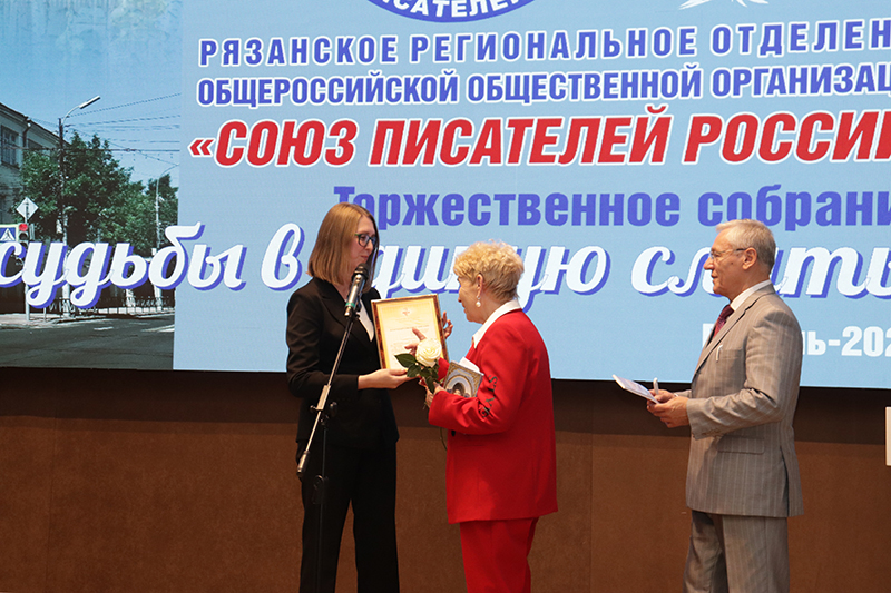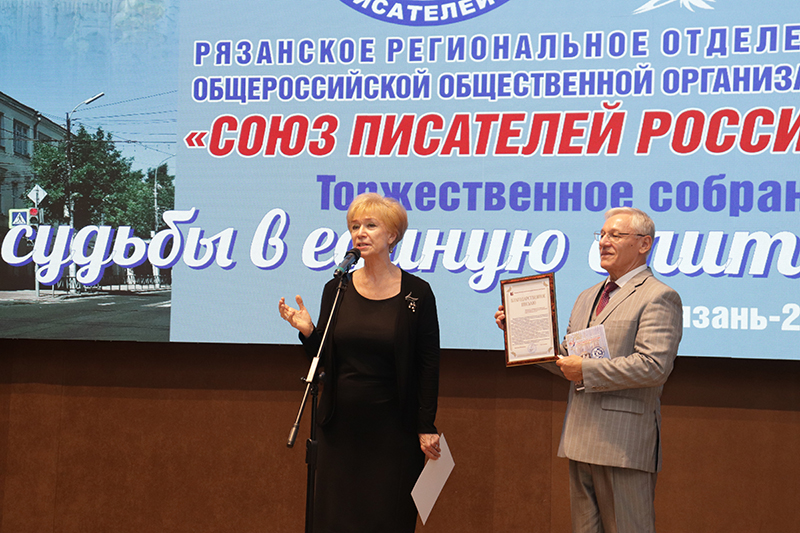 Директор библиотеки имени Горького, председатель Общественной палаты Рязанской области, заслуженный работник культуры РФ Наталья Гришина тепло поздравила рязанских писателей с юбилеем. Она отметила, что за годы работы рязанская писательская организация по-прежнему верна тем заветам и традициям, которые оставили наши великие соотечественники.