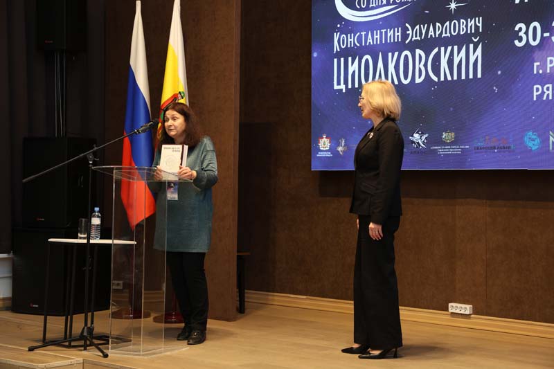 Оксана Эльмировна Бубликова, заведующая отделом, музеем-квартирой К.Э. Циолковского в г. Боровске, вручила Рязанской областной библиотеке имени Горького приветственный адрес и буклет «Циолковский в Боровске».