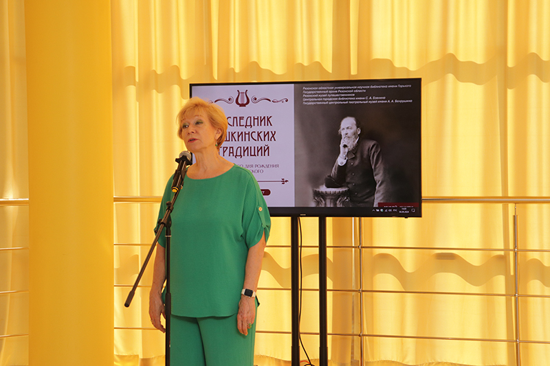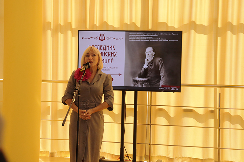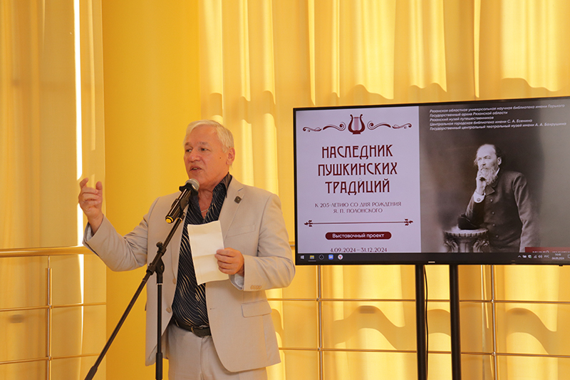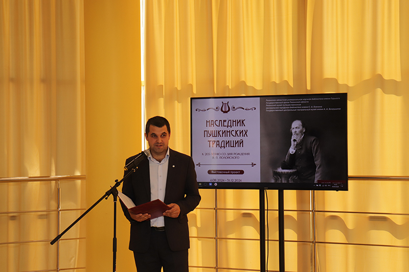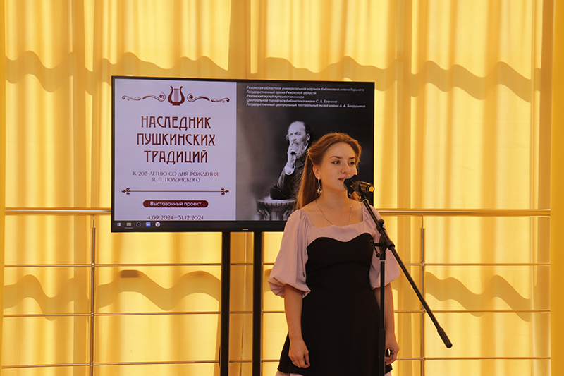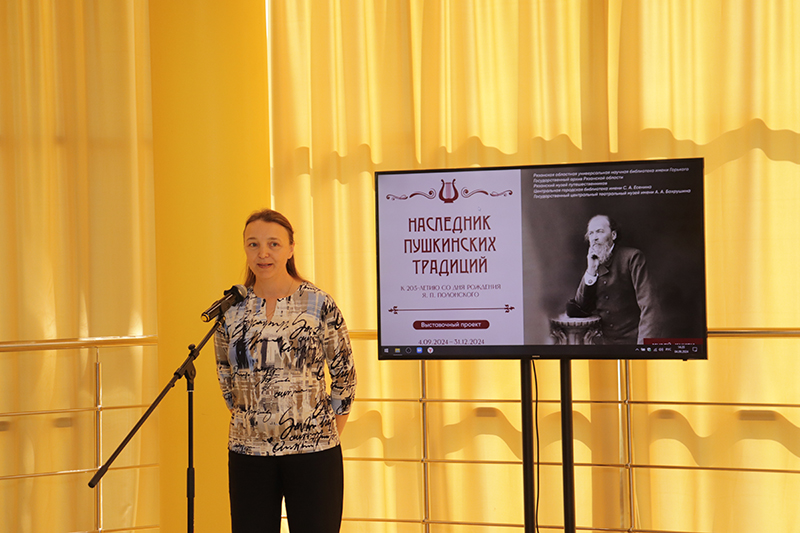 Наталья Николаевна Гришина, директор Рязанской областной универсальной научной библиотеки имени Горького, председатель Общественной палаты, регионального отделения Союза женщин России, заслуженный работник культуры Российской Федерации, рассказала о проектной деятельности библиотеки, направленной на популяризацию имени и творчества Я.П. Полонского, особенно среди детей и молодежи. Затем Н.Н. Гришина выразила благодарность партнерам библиотеки и сотрудникам, подготовившим выставку.