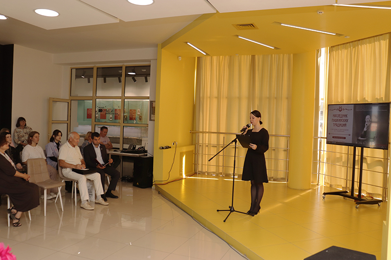 В начале презентации выставочного проекта прозвучало стихотворение Дмитрия Цертелева «Я.П. Полонскому» в исполнении Анастасии Лариной, актрисы театра «Переход» имени Геннадия Кириллова.