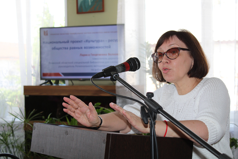 Л.Г. Волкова, руководитель Регионального методического центра по работе с инвалидами, отметила, что национальный проект «Культура» уделяет самое серьезное внимание работе с людьми с ограниченными возможностями здоровья, и задача библиотек – использовать эти возможности в полном объеме, применяя инновационные формы и методы работы, активно развивая сотрудничество с некоммерческими организациями. С итогами анкетирования по обслуживанию инвалидов в условиях муниципальных библиотек присутствующих познакомила Л.В. Вошкина, главный библиотекарь этого центра, отметив, что далеко не во всех библиотеках созданы оптимальные условия для работы с данной категорией пользователей.