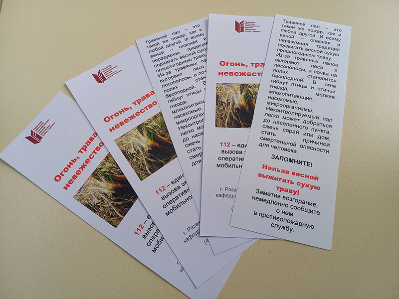 Наша акция «Огонь, трава, невежество» предостерегает рязанцев от опасной и неразумной привычки поджигать весной сухую прошлогоднюю траву. В настоящее время уже открыт пожароопасный сезон. Поэтому необходимо помнить, что основным виновником пожаров является человек – его небрежность при использовании огня во время работы и отдыха.