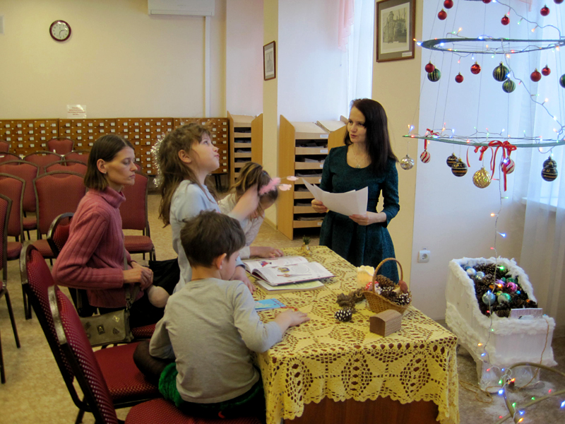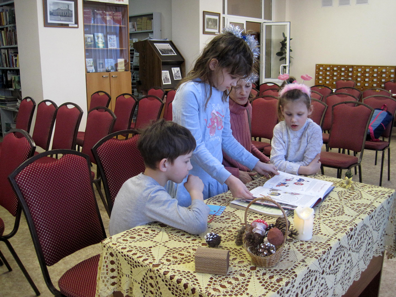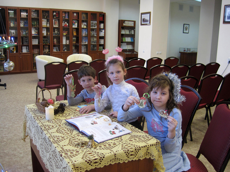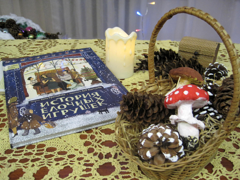 Дети узнали, из каких материалов изготавливались игрушки. Это и традиционное стекло, и картонаж, и удивительные украшения из ваты. Ответив на вопросы викторины, гости выяснили, почему наши предки поклонялись елке, как на елке засияли звезды, зачем елку на пол валили, как елка спасала, как елка объединяла. Довольные посетители унесли домой новогодние игрушки в технике «картонаж», а сделанные из хлопка грибы перекочевали в корзинку краеведов, завершив новогоднюю композицию.
