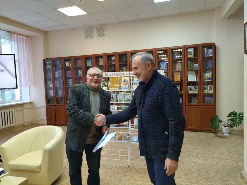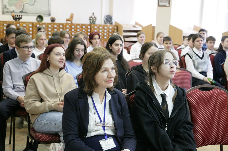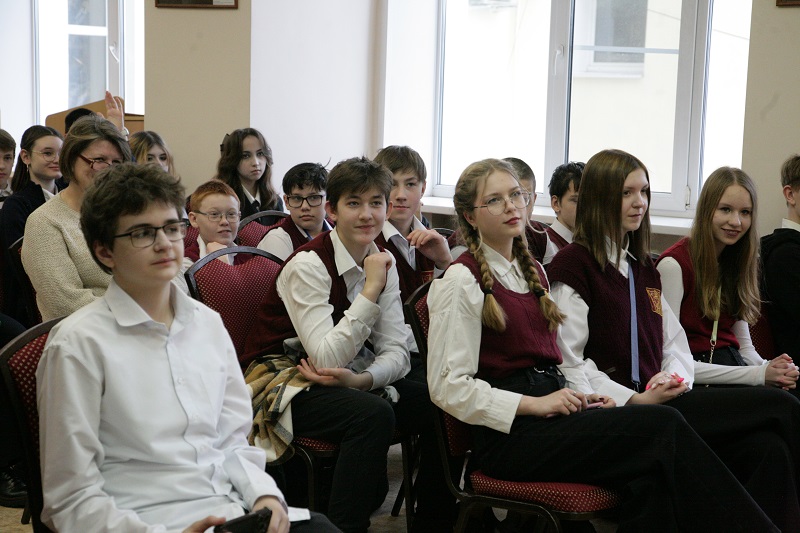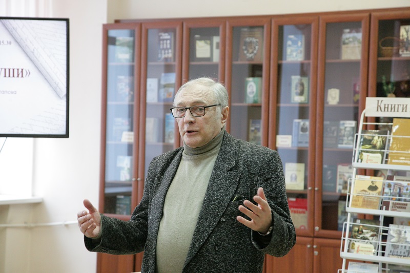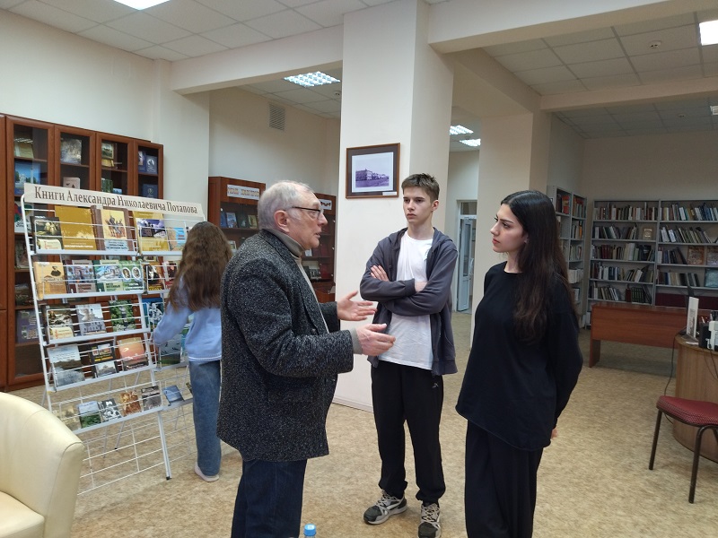 В литературной гостиной краеведческого отдела собрались студенты Рязанского медицинского колледжа и учащиеся рязанских школ № 11, 47, 50, 68. Александр Николаевич поздравил молодых людей с наступающим Днем защитника Отечества. В своем писательском слове он коснулся специальной военной операции, с начала которой 24 февраля исполняется два года. А.Н. Потапов рассказал о своей поездке в Донецк в 2019 году и участии в Днях русского языка.
