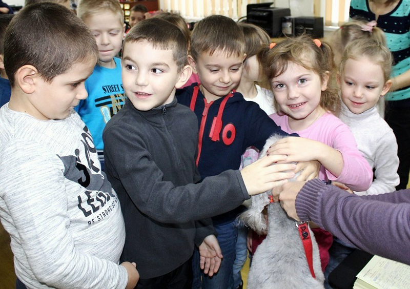 Ольга Дмитриевна рассказала также о выставках и соревнованиях, в которых участвует Настя, и предложила посмотреть детям слайды из презентации, на которых собака одета в костюмы пчелки и принцессы для участия в конкурсе. Каждый ребенок пожелал сфотографироваться с четвероногим питомцем, а некоторые детки даже захотели прочитать ей стихи.