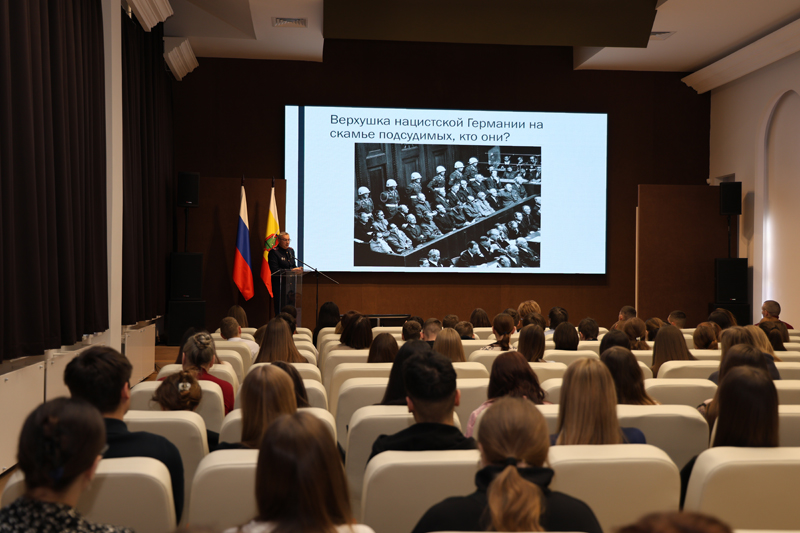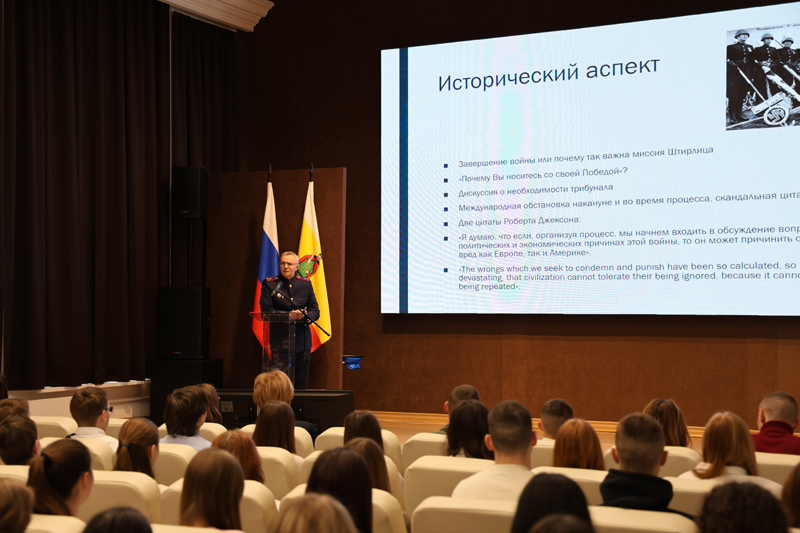 Лекцию прочел руководитель контрольно-следственного отдела следственного управления Следственного комитета России по Рязанской области Александр Александрович Чикалов. Он подробно рассказал о значении Нюрнбергского процесса для формирования принципов борьбы с преступлениями против человечности, а также о его влиянии на современное уголовное право. Александр Александрович отметил, что этот процесс стал основой для создания международных трибуналов и разработки новых норм в области прав человека.
