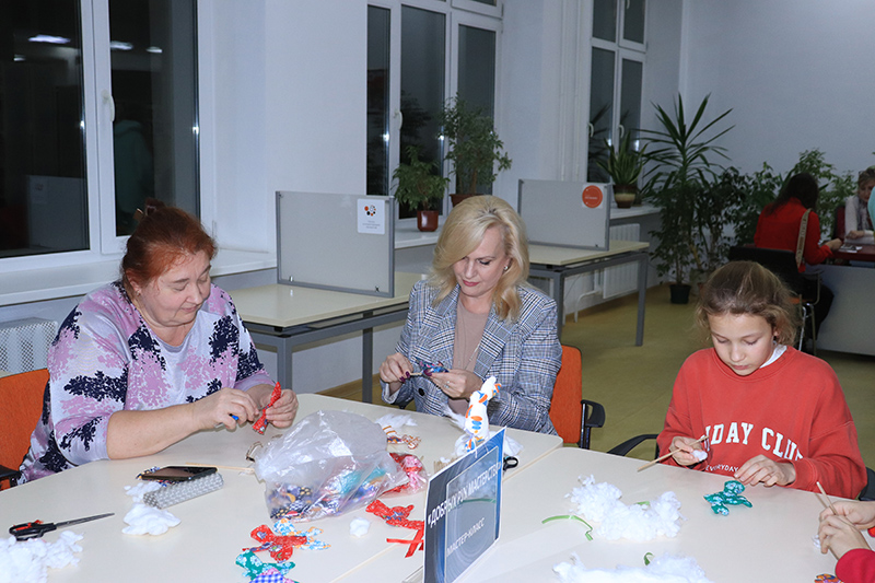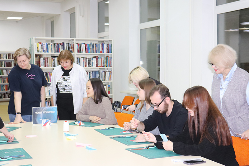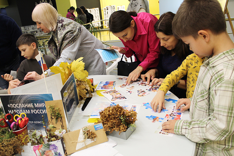 Душа и традиции народа воплощены в его промыслах, в неповторимых изделиях, костюмах. На площадке «Графический эксперимент» посетители библиотеки познакомились с особенностями якутского, башкирского, татарского национального орнамента и орнамента народа коми. С помощью цветных карандашей и фломастеров украсили предметы национальной одежды соответствующими узорами. На мастер-классе «Добрых рук мастерство» участники изготовили из ткани и ваты игрушки в виде животных. Очаровательные подарочные коробочки на площадке «Сувенир своими руками» создали гости библиотеки, а в зале клубной работы – мини-блокноты с изображением представителей разных народов в национальных костюмах. На мастер-классе по валянию из шерсти от творческой мастерской «Шмель» маленькие посетители сделали тыквочки – символ осеннего урожая. Открытки с добрыми словами близким, книжные закладки-оригами в виде лисичек были выполнены с большим умением на станциях в универсальном читальном зале.