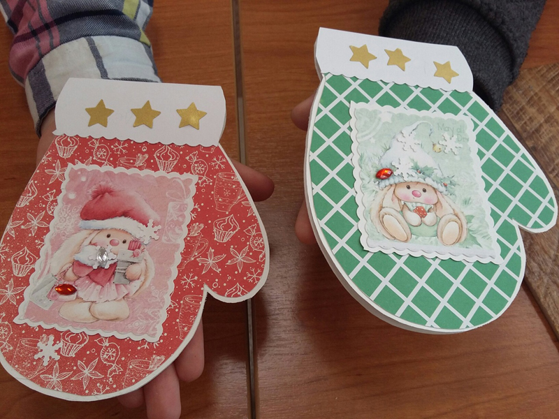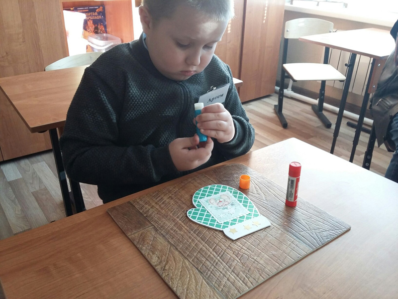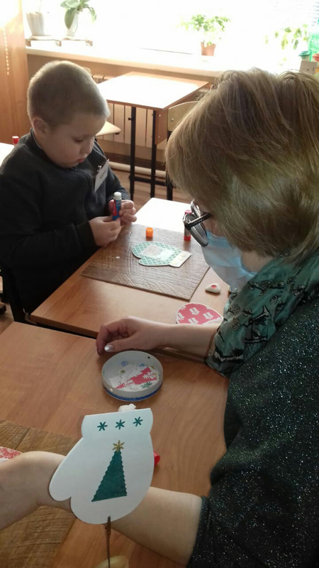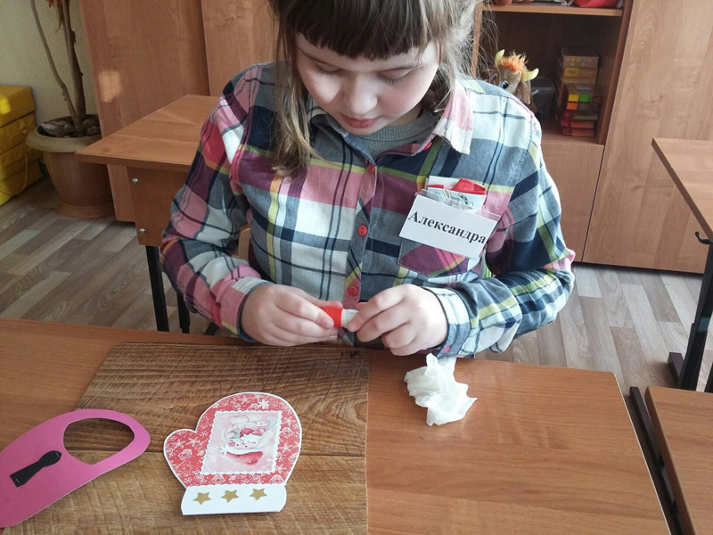 В начале урока ребята посмотрели видеоролик «Что такое Новый год?» с песенкой из старого мультфильма, в ходе беседы вспомнили об основных атрибутах любимого праздника, а затем приступили к изготовлению открытки в виде варежки. Еще не все легко дается маленьким детским ручкам, но со всеми задачами участники отлично справились. В перерыве между заданиями они поиграли в веселую разминку, а потом с новыми силами закончили свои работы.