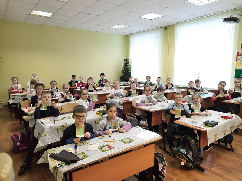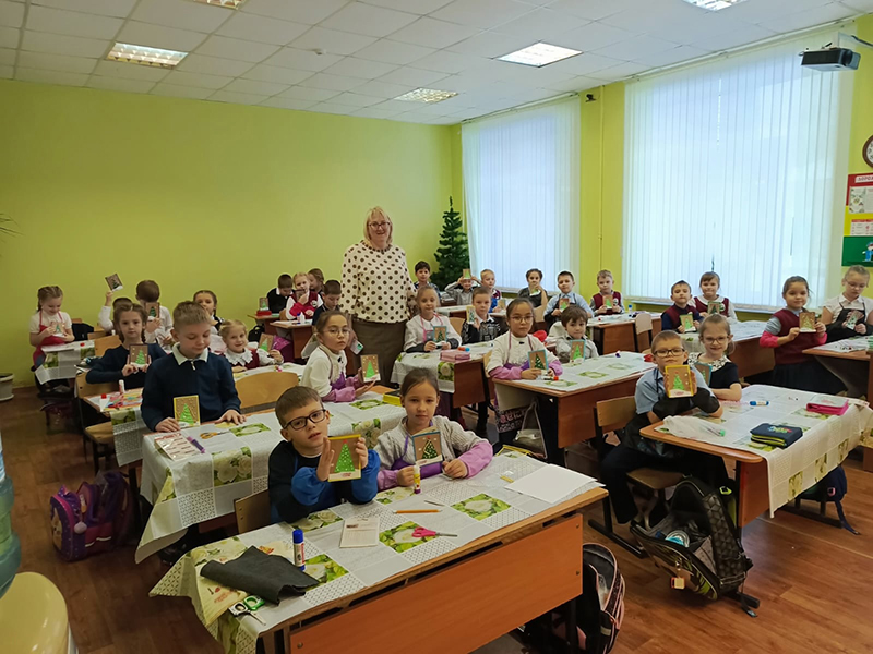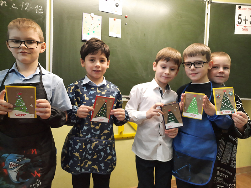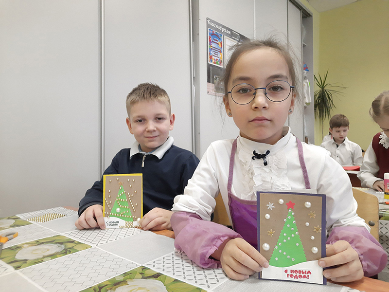 Мальчишки и девчонки внимательно слушали все инструкции, аккуратно подготовили основу для поздравительной открытки, а затем украсили свой новогодний подарок разноцветными бусинами, пайетками и бумажными снежинками.