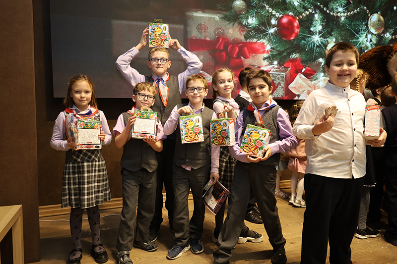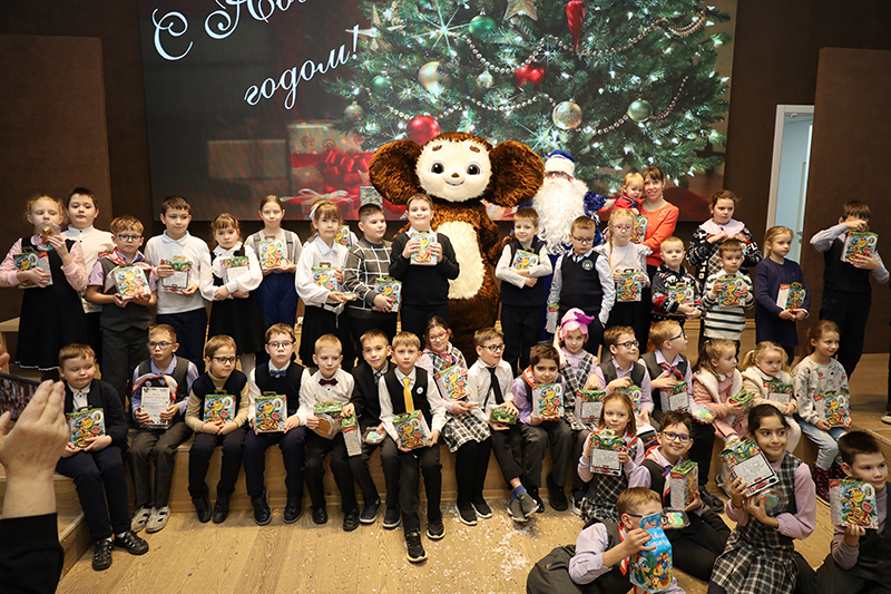 По завершении новогоднего представления все участники получили сладкие новогодние подарки, которые им вручил любимый друг Чебурашка.
