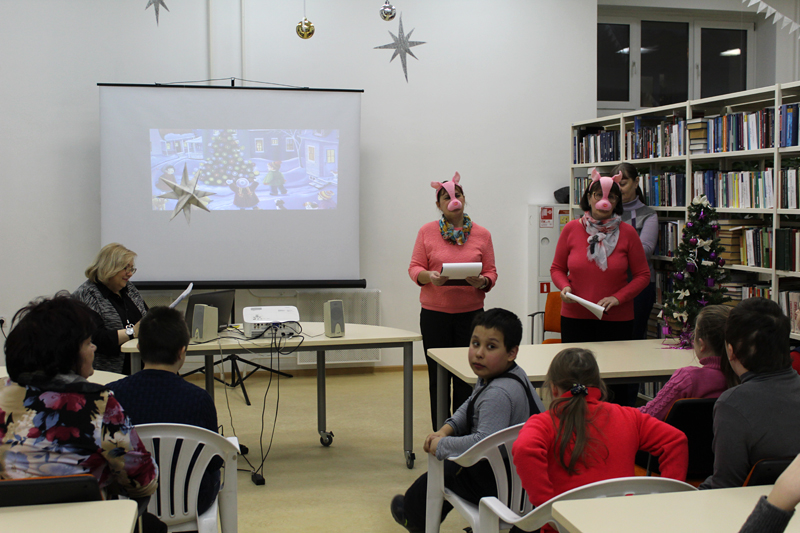 Сегодня библиотекари перевоплотились в поросят Чуню и Хрюню (очаровательная свинка – символ 2019 года) и мастерили с ребятами новогоднюю открытку. Дети с восторгом отгадывали зимние загадки, смотрели мультфильм про поросенка Чуню и танцевали вокруг елки.
