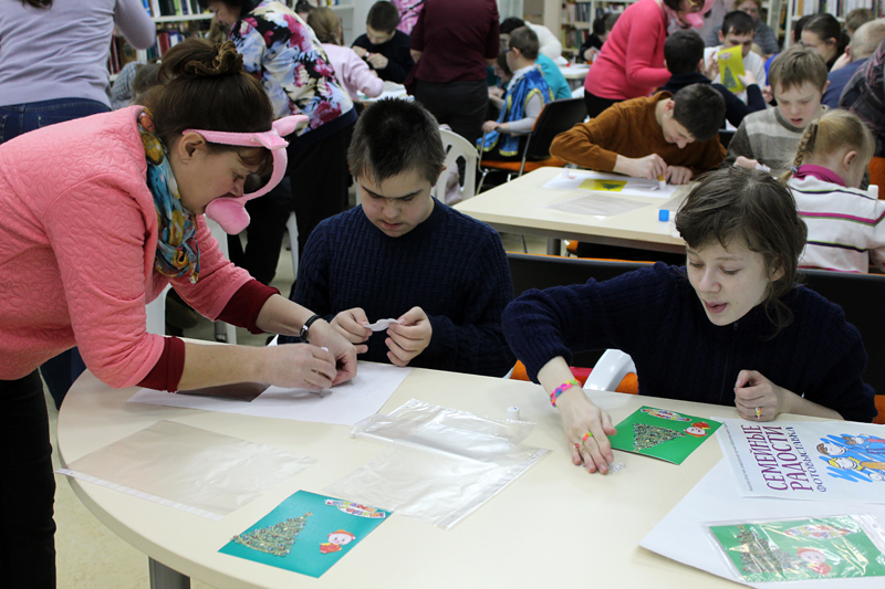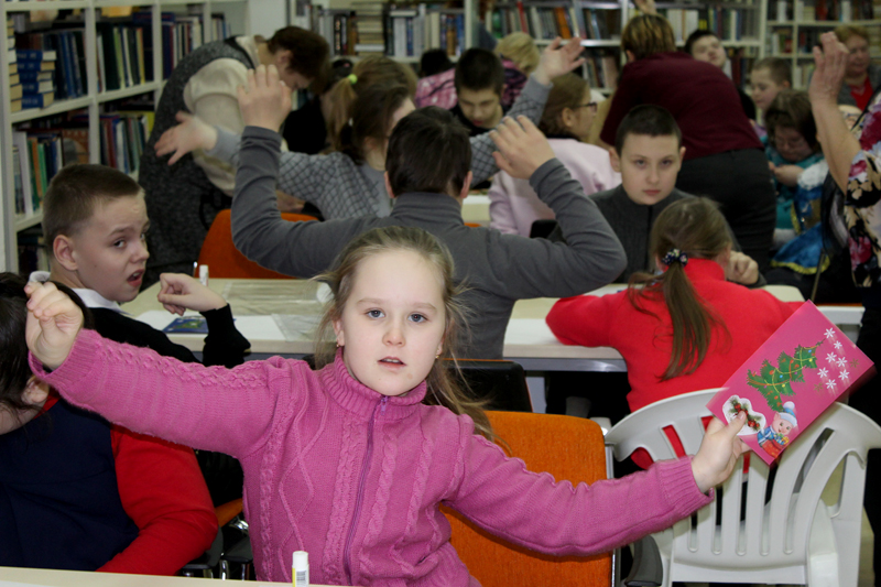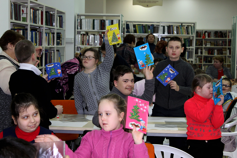 Воспитанники школы-интерната подарили сотрудникам библиотеки новогоднюю открытку, которую сделали своими руками.