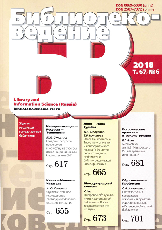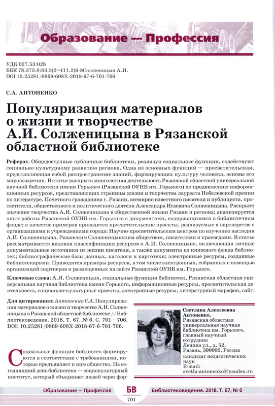 Научно-практический журнал «Библиотековедение» в №6 за 2018 год опубликовал статью главного научного сотрудника библиотеки им. Горького Светланы Антоненко «Популяризация материалов о жизни и творчестве А.И. Солженицына в Рязанской областной библиотеке».