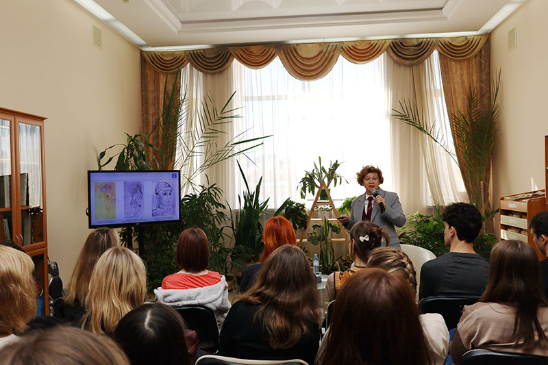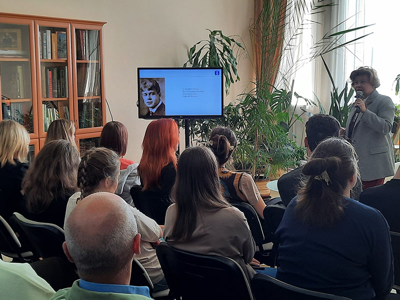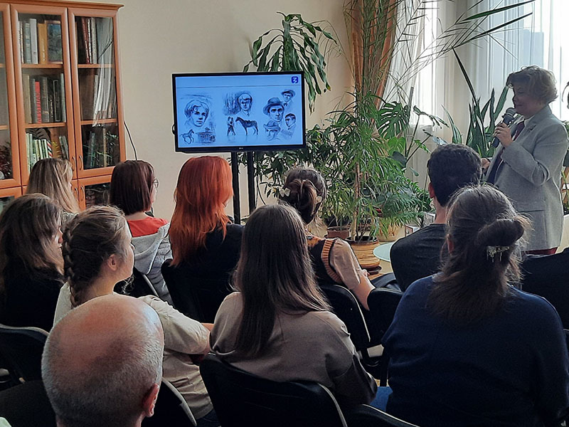 Каждый портрет Есенина – отражение какого-то момента его жизни, фрагмент яркой творческой биографии. При жизни поэта было создано около 30 его изображений. Слушатели узнали о работах художников разных лет – от работ современников Есенина – А. Бенуа, В. Юнгера, Б. Григорьева, а также известных работах С. Якушевского, А. Яр-Кравченко, Л. Шарлемань до произведений наших современников. Юлия Михайловна показала разнообразие образов поэта и отражение в них знаковых моментов его жизни, рассказала истории возникновения некоторых художественных произведений, продемонстрировала примеры книжной графики, живописи.