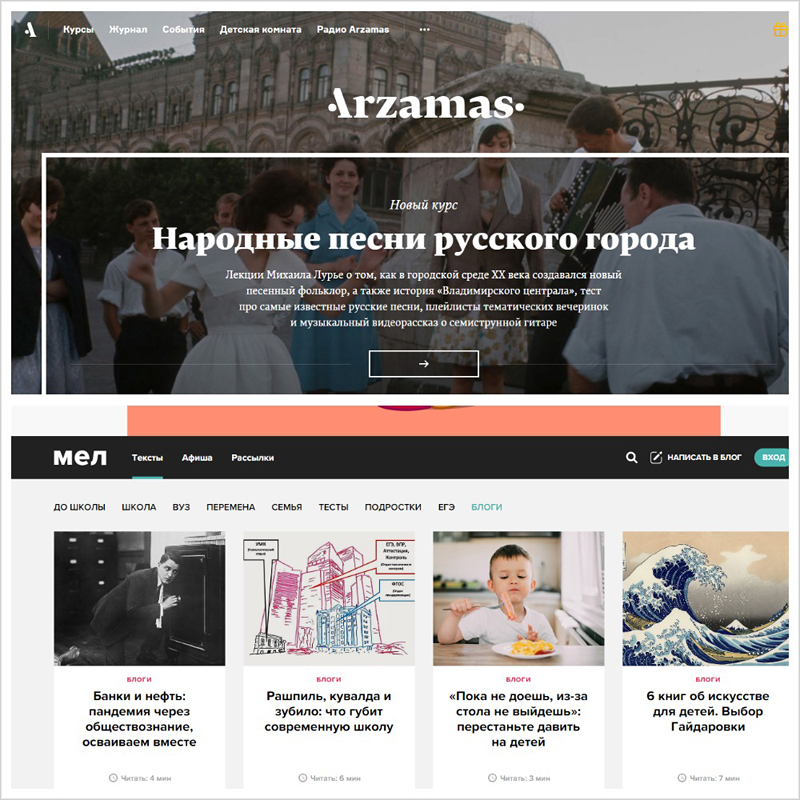 «Arzamas. Academy» – проект, посвященный истории культуры(литературе, искусству, истории и другим гуманитарным наукам). Материалы представлены в различных форматах: аудио- или видеолекции и сопроводительные материалы, фотогалереи и кинохроники, интервью со специалистами и списки литературы, игры и тесты, онлайн-представительства лучших музеев и университетов.