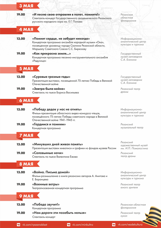 В акции примут участие ведущие учреждения культуры региона, подготовившие специально к этому событию концертные и театральные программы, видеофильмы, презентации, виртуальные выставки, которые будут транслироваться для жителей области в сообществах Вконтакте Рязанская область и Культура и туризм с 30 апреля по 9 мая 2020 г. ежедневно, в 13.00 и 19.00.