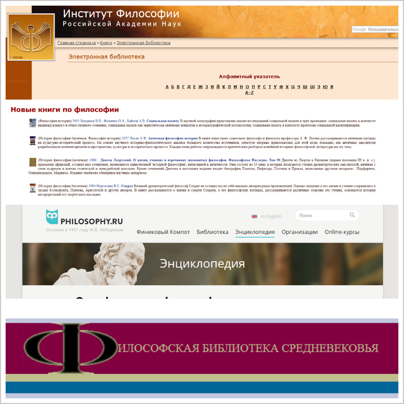 Электронная библиотека Института философии Российской академии наук – это библиотека философских текстов, посвященных основам философии, религиозно-философской мысли Древней Руси, русской философии, а также содержит библиографии исследований.