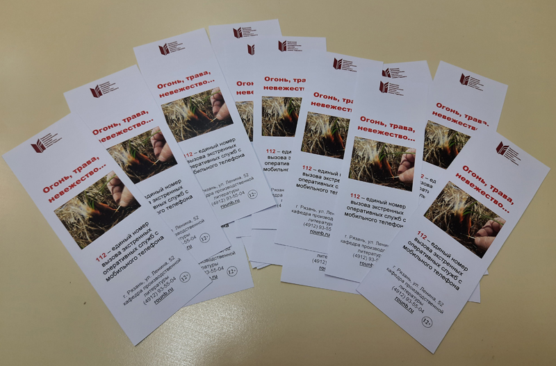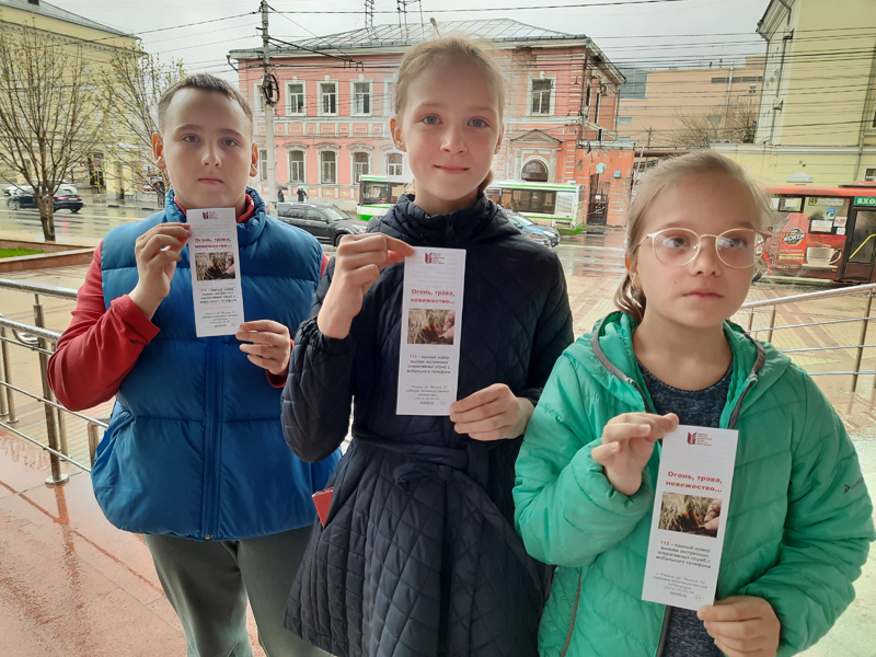 Акция «Огонь, трава, невежество» предостерегает от опасной и неразумной привычки поджигать весной сухую прошлогоднюю траву. Организаторы акции вручали рязанцам и гостям города книжные закладки с информацией о пагубных последствиях травяных палов для окружающей среды и человека. Посетителям библиотеки были продемонстрированы видеоматериалы о тяжелых результатах поджога травы.