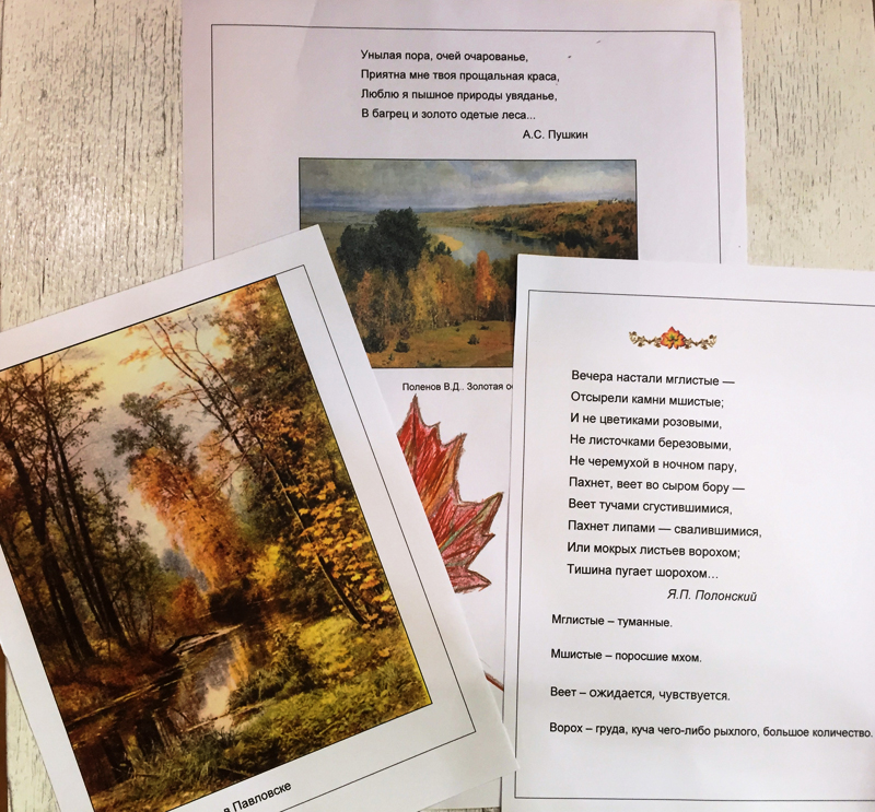 Знакомство со стихами А.С. Пушкина, Я.П. Полонского, С.А. Есенина и картинами И.И. Шишкина, И.И. Левитана, В.Д. Поленова, Е.Е. Волкова завершилось выразительным чтением. Дети с удовольствием декламировали стихи С.А. Есенина, день рождения которого мы отметили накануне. В завершение познавательного часа маленькие гости библиотеки с увлечением принялись украшать открытки, на которых были напечатаны отрывки из стихотворений и размещены репродукции картин с осенним пейзажем.