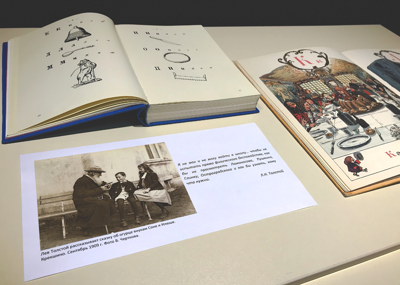 Л.Н. Толстой считал одной из важнейших задач своей жизни образование народа. «Другое теперь нужно. Не нам нужно учиться, а нам нужно Марфутку и Тараску выучить хоть немножко тому, что мы знаем», – писал он. Созданию учебных книг Л.Н. Толстой посвятил в общей сложности 17 лет напряженного труда. Для «Азбуки» 1872 г., явившейся обобщением педагогического опыта писателя, и «Новой азбуки», увидевшей свет в 1875 г., им было написано 629 произведений, вошедших в юбилейное репринтное издание, представленное на выставке.